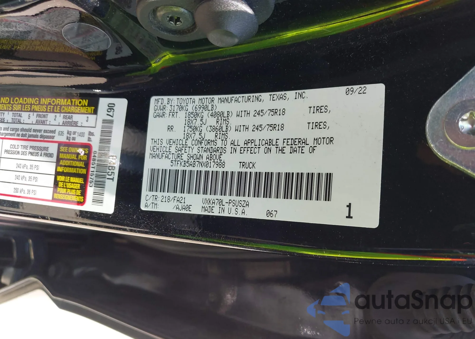 Автомобиль Toyota Tundra 2022 (VIN 5TFKB5AB7NX017988) имеет документы, препятствующие регистрации. Могут возникнуть сложности при экспорте и регистрации. Обратитесь к экспертам AutaSnap для поиска альтернатив.