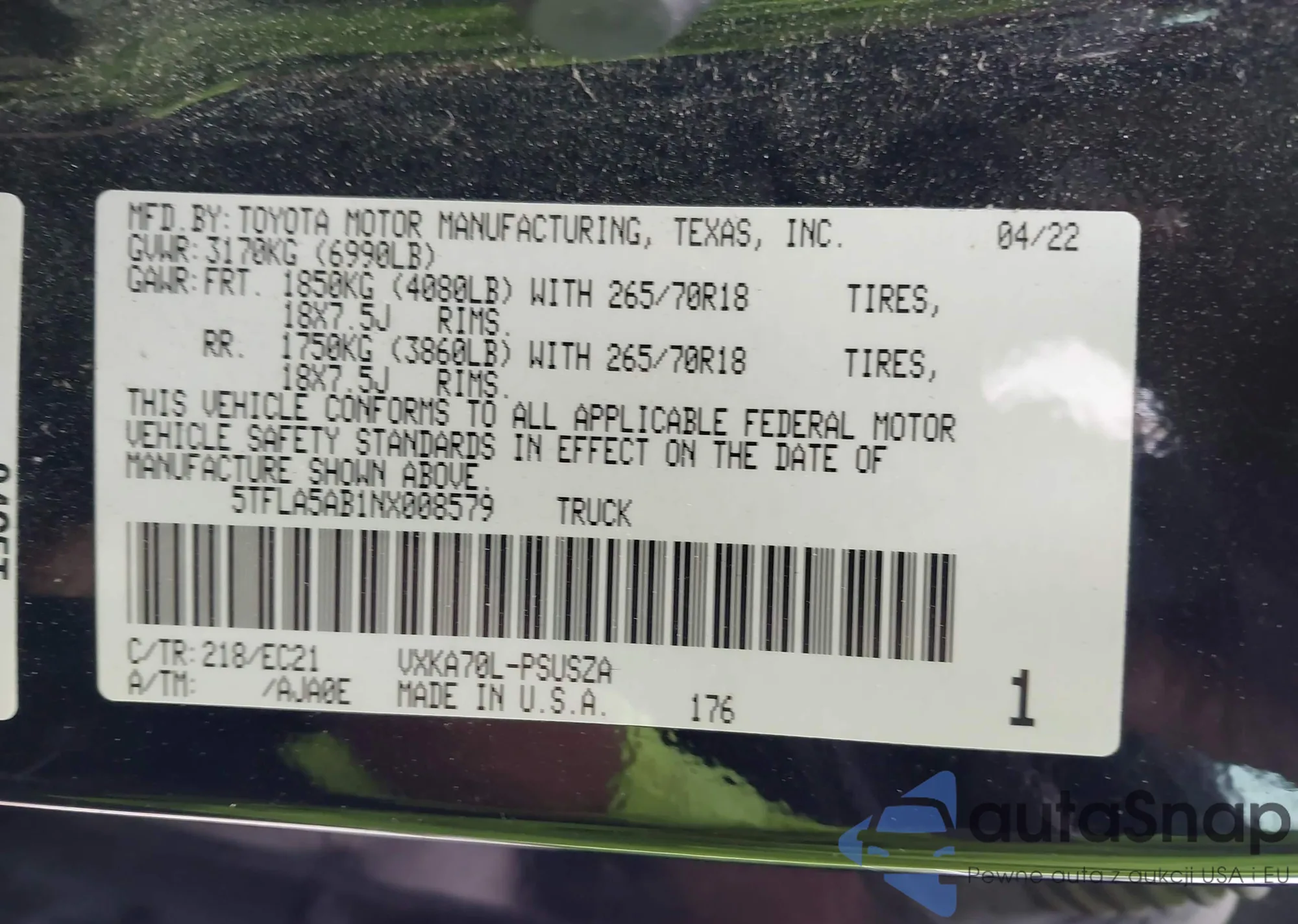• VIN: 5TFLA5AB1NX008579