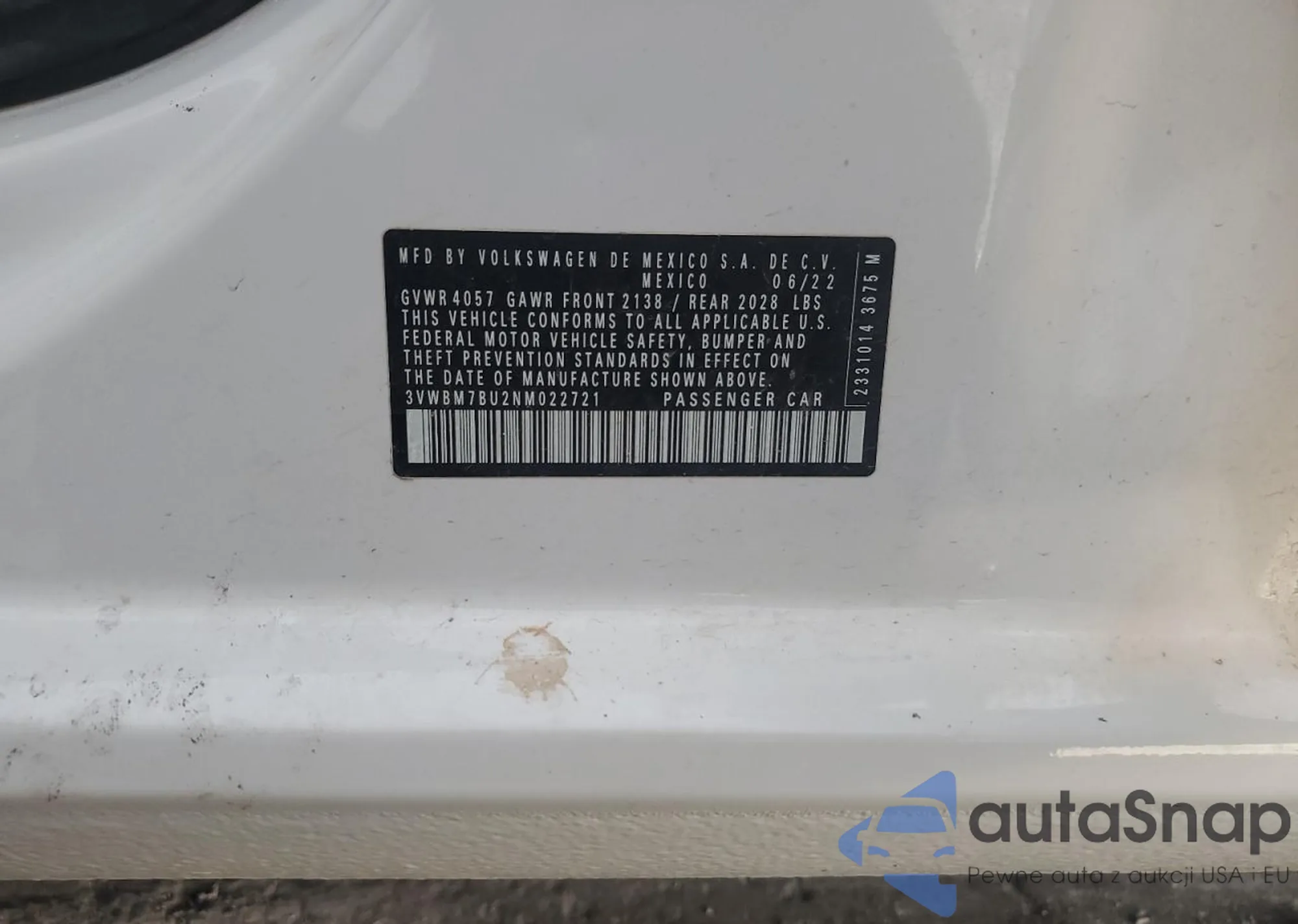 Автомобиль Volkswagen Jetta 2022 (VIN 3VWBM7BU2NM022721) ранее не участвовал в торгах. Документы чистые, пробег соответствует или ниже среднего по рынку. Продаётся страховой компанией — рекомендуем покупку. Доставка в порт займет около 6–8 недель.