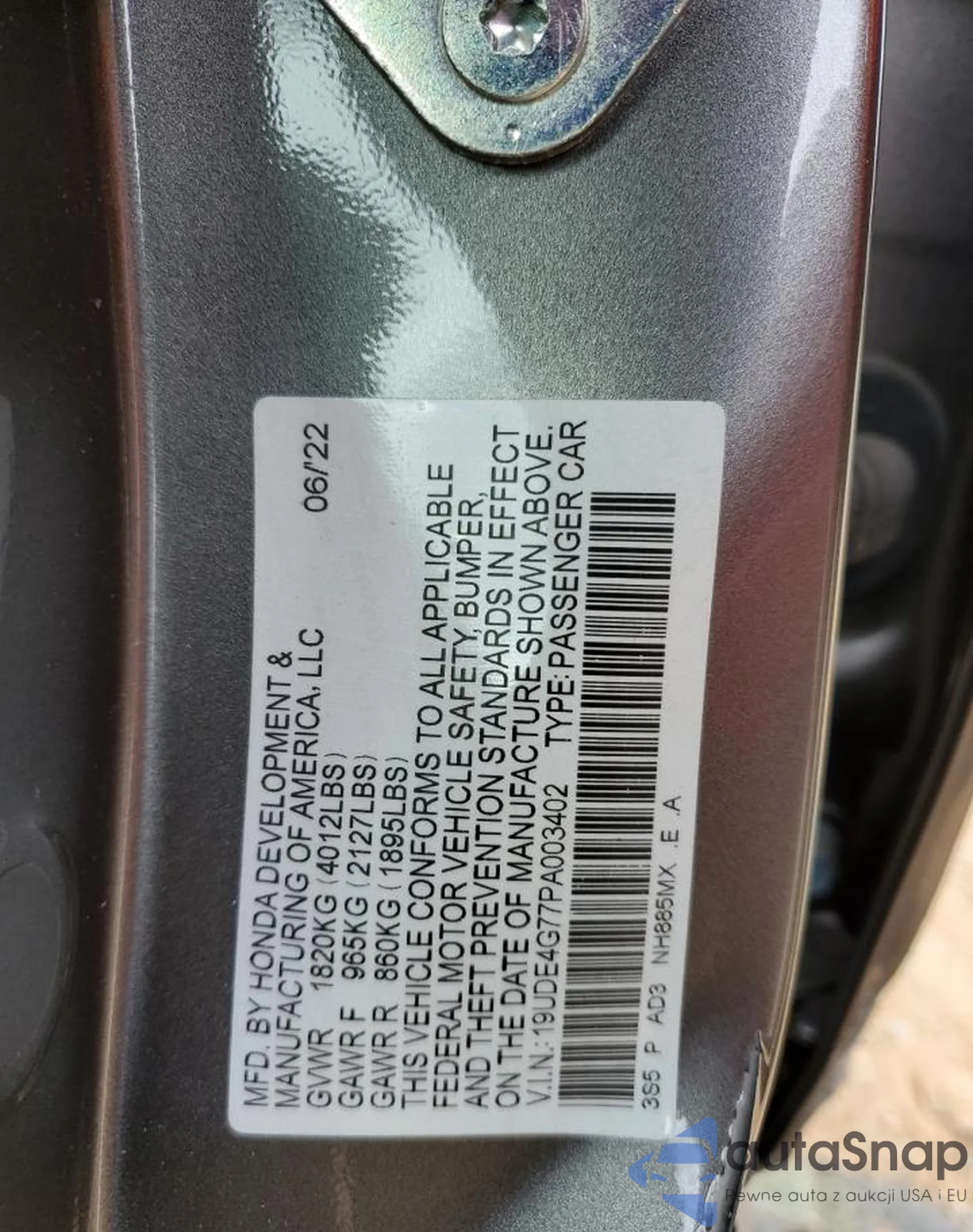 VIN: 19UDE4G77PA003402