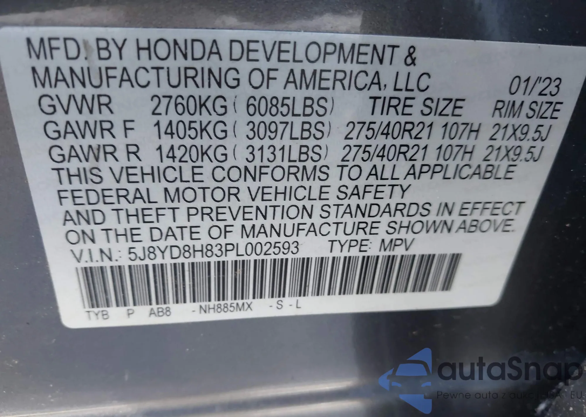 VIN: 5J8YD8H83PL002593