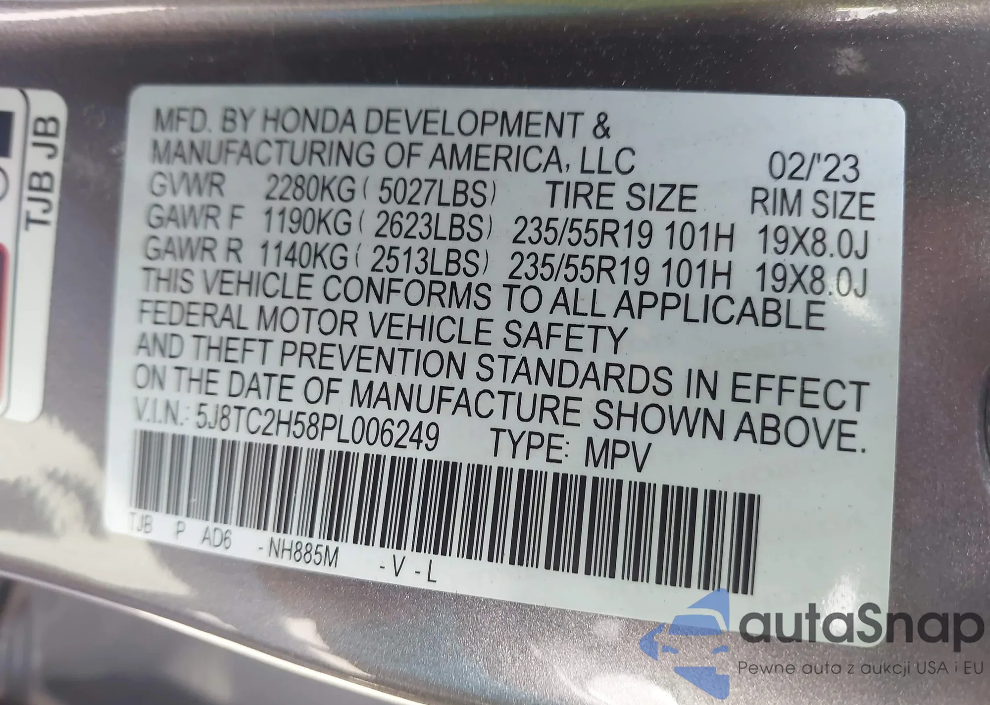 VIN: 5J8TC2H58PL006249