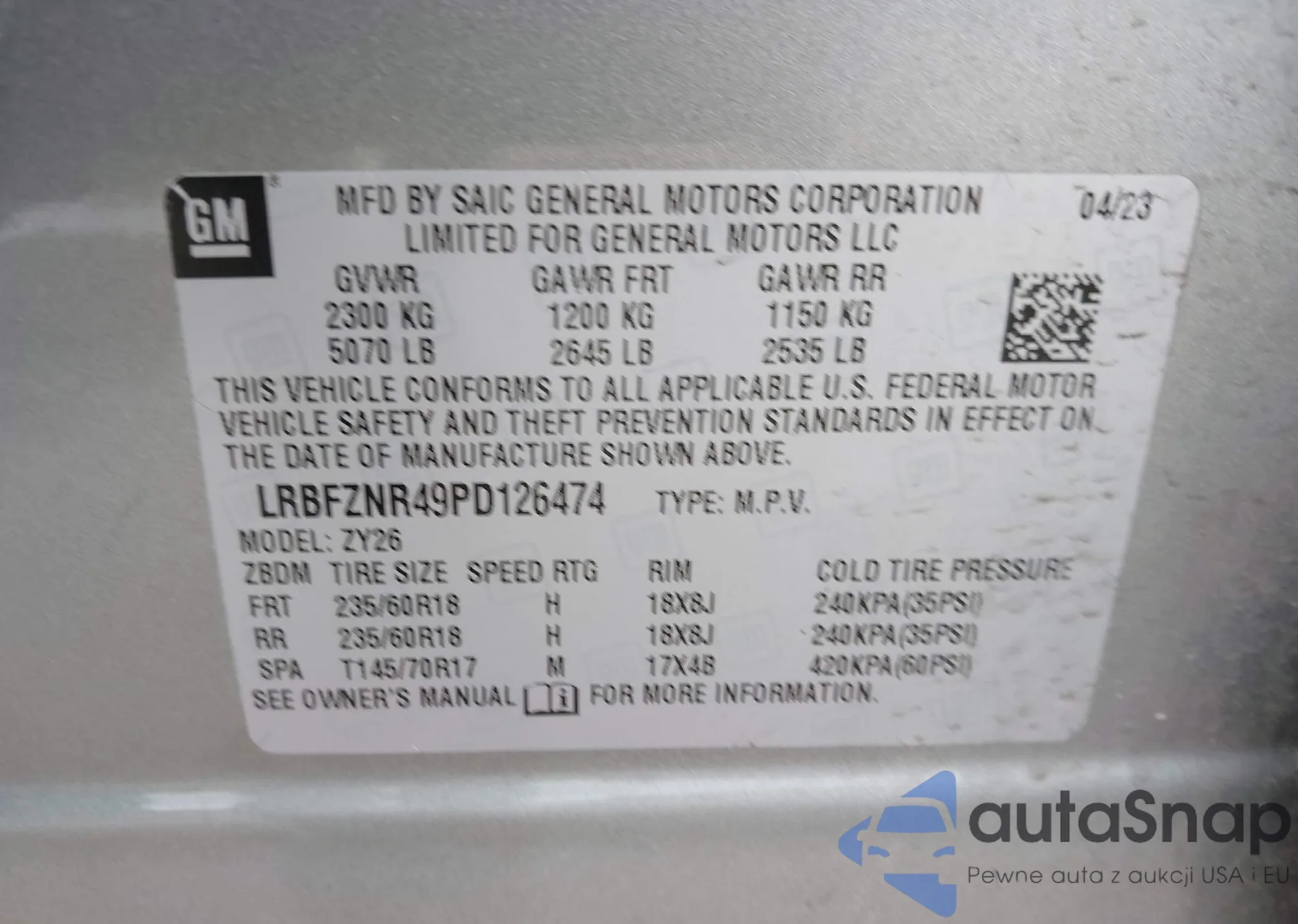 Автомобиль Buick Envision 2023 (VIN LRBFZNR49PD126474) уже участвовал в торгах 1 раз(а) и/или продаётся непроверенным продавцом. Рекомендуем проверить отчет Carfax и подтвердить возможность регистрации перед покупкой.