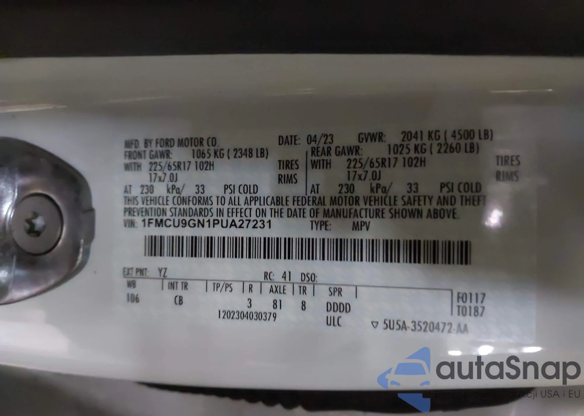• VIN: 1FMCU9GN1PUA27231