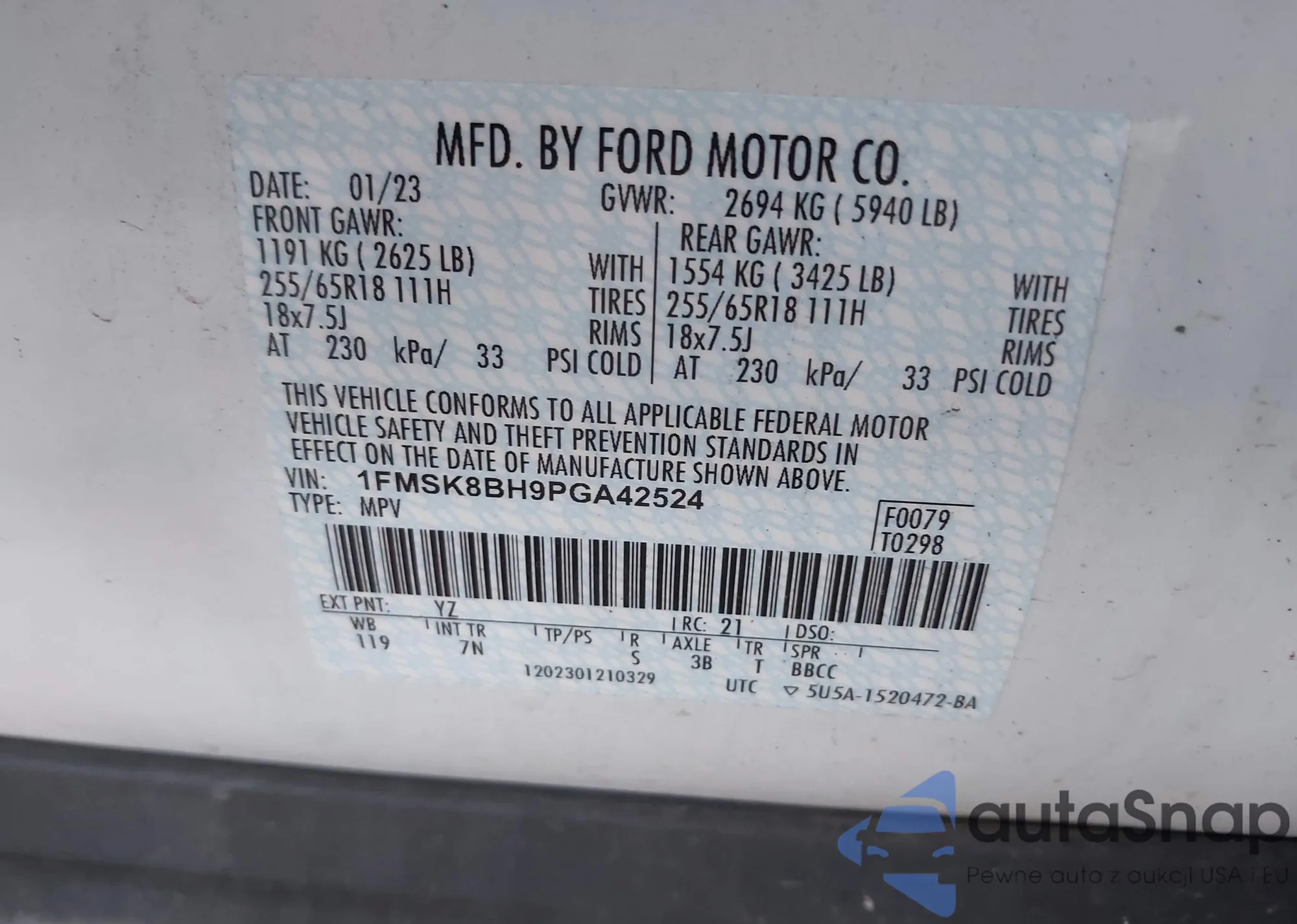 VIN: 1FMSK8BH9PGA42524