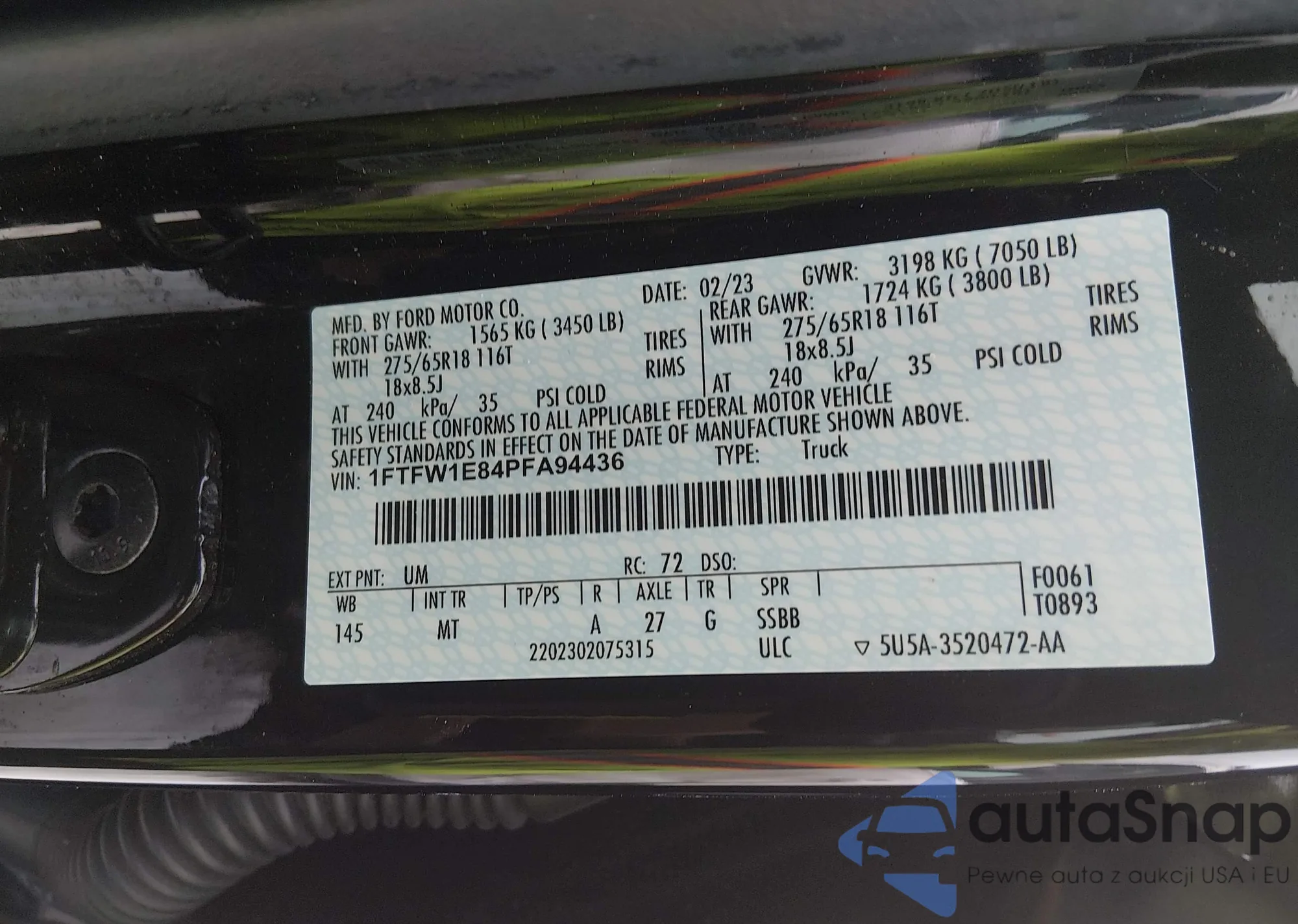 Автомобиль Ford F-150 2023 (VIN 1FTFW1E84PFA94436) ранее не участвовал в торгах. Документы чистые, пробег соответствует или ниже среднего по рынку. Продаётся страховой компанией — рекомендуем покупку. Доставка в порт займет около 6–8 недель.