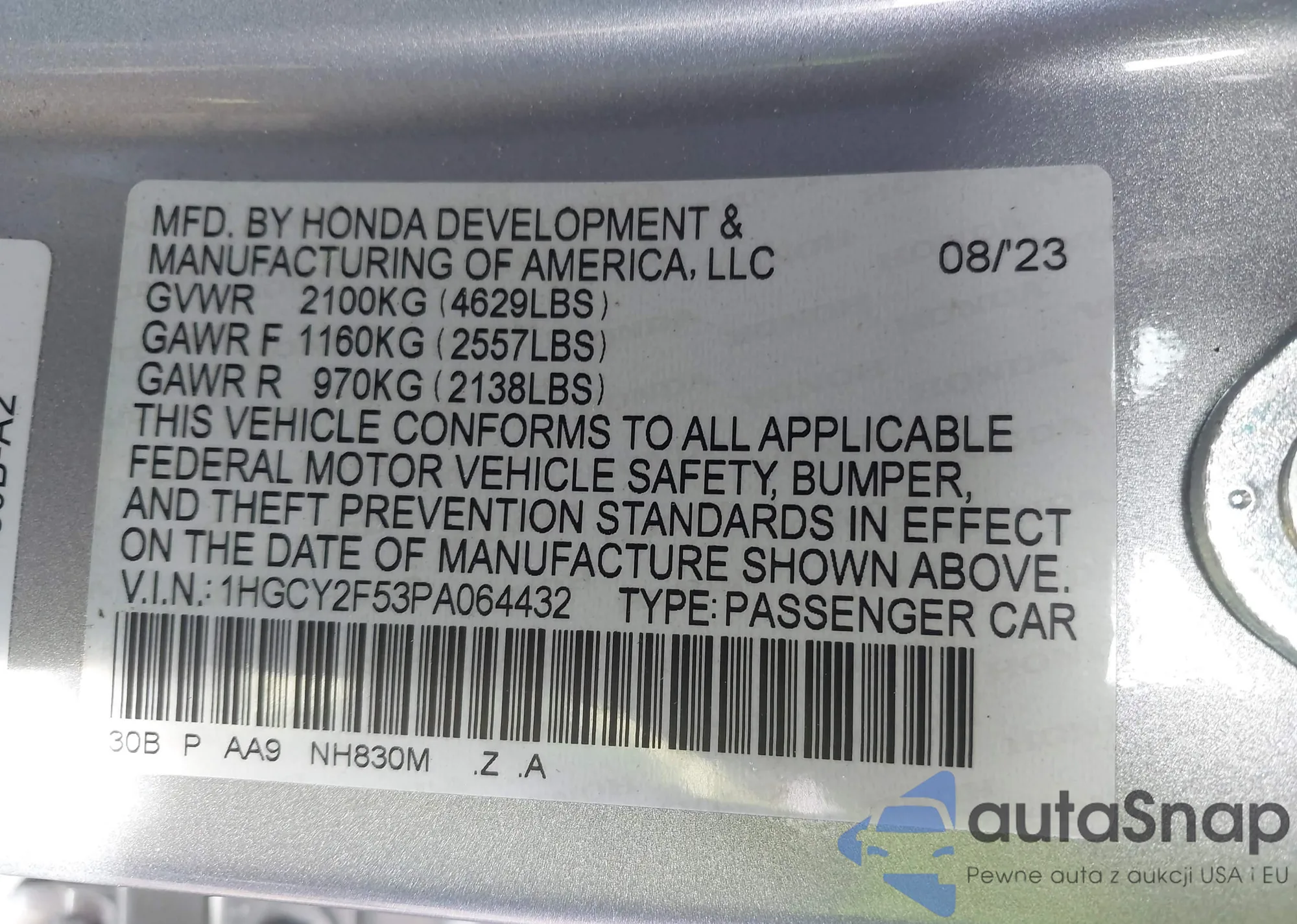 Автомобиль Honda Accord 2023 (VIN 1HGCY2F53PA064432) ранее не участвовал в торгах. Документы чистые, пробег соответствует или ниже среднего по рынку. Продаётся страховой компанией — рекомендуем покупку. Доставка в порт займет около 6–8 недель.