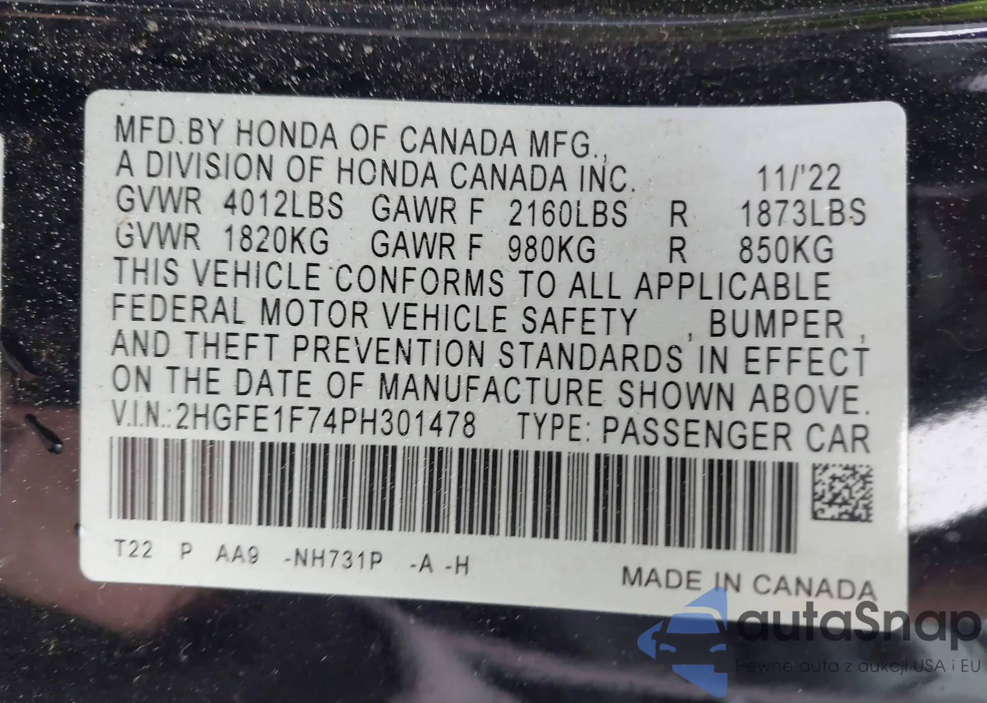 VIN: 2HGFE1F74PH301478