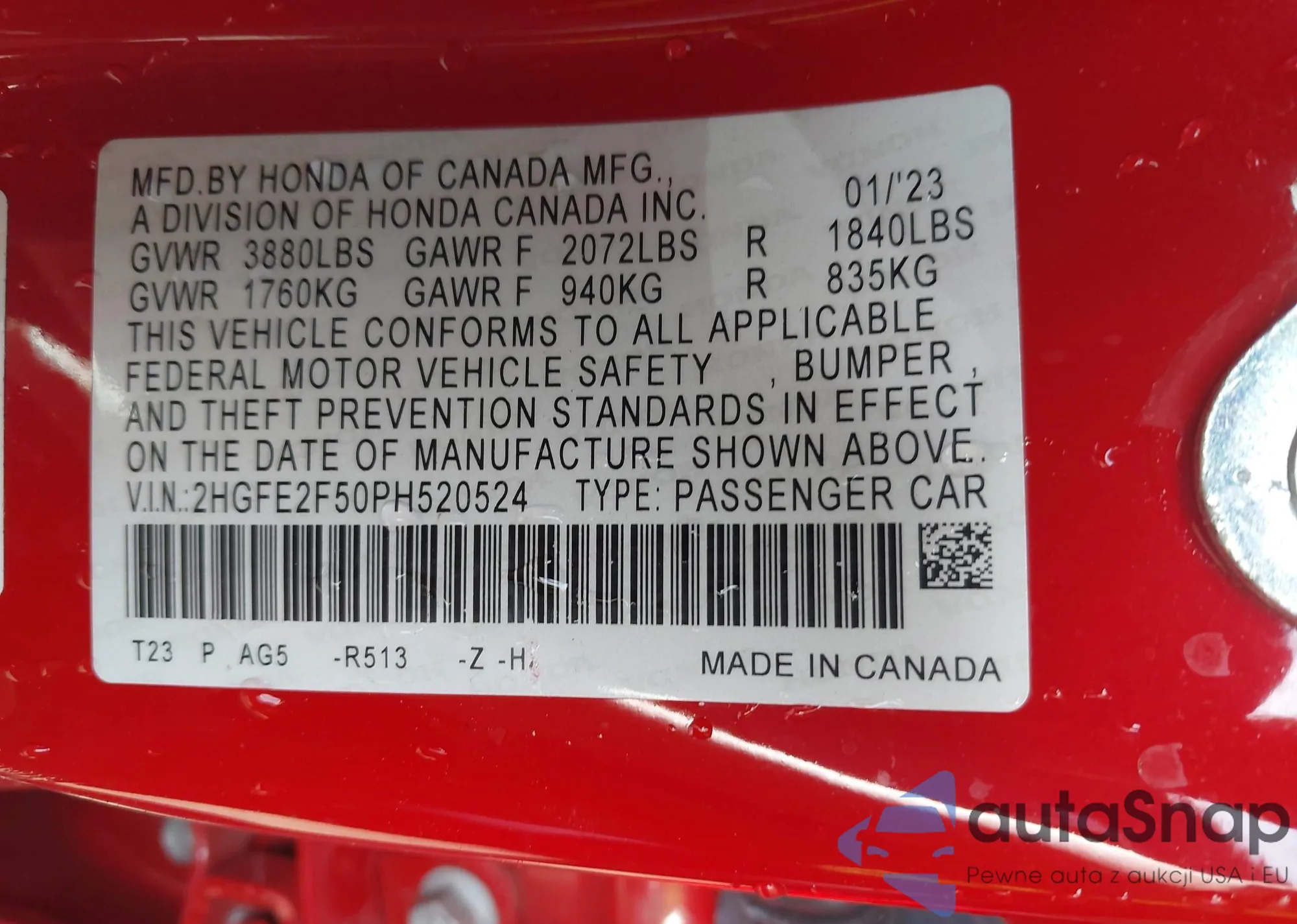 VIN: 2HGFE2F50PH520524