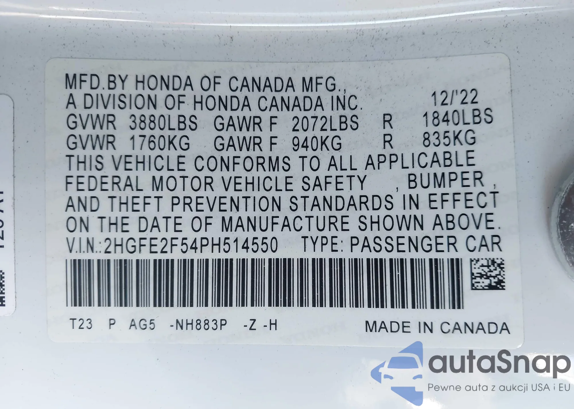 VIN: 2HGFE2F54PH514550
