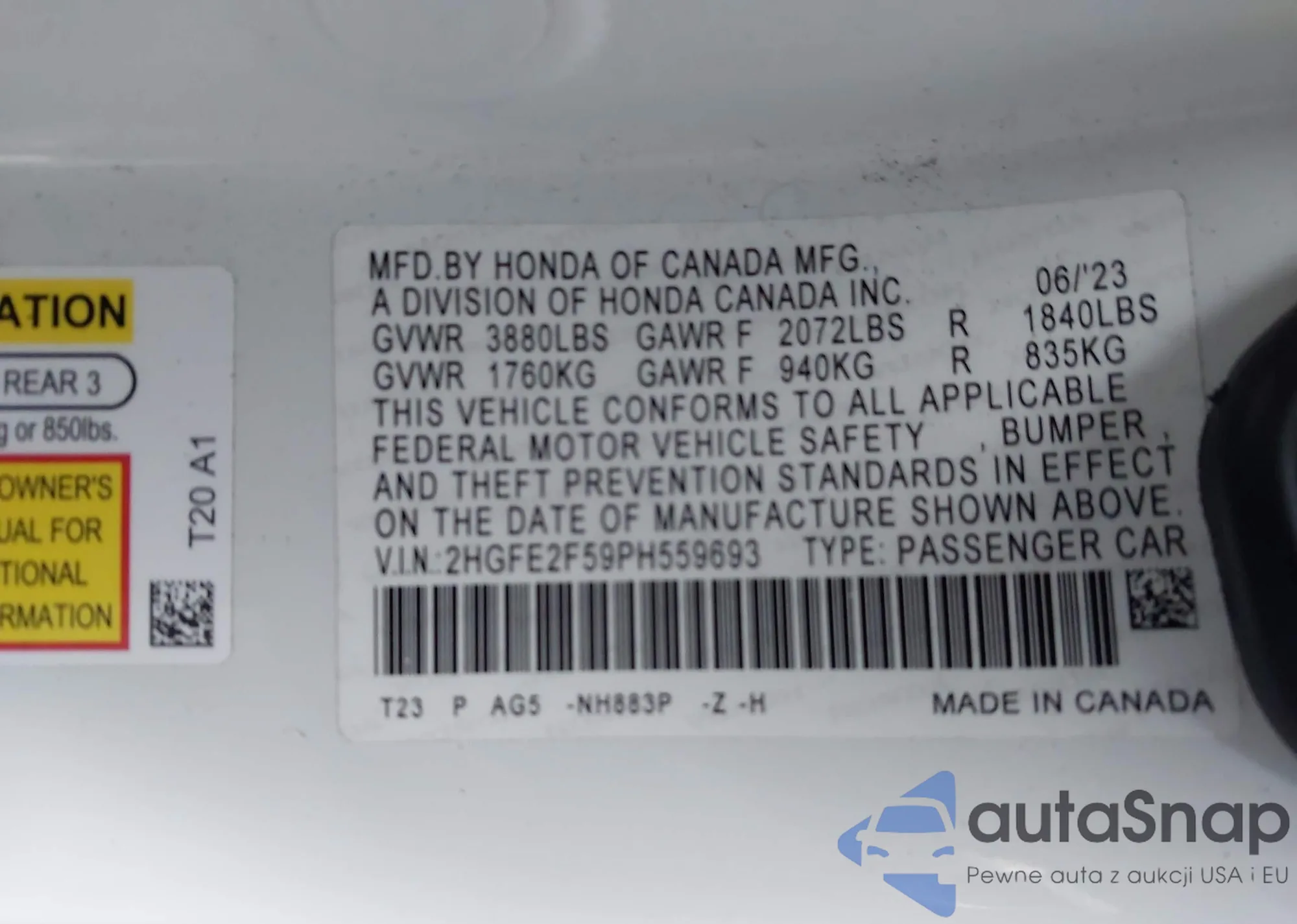 Автомобиль Honda Civic 2023 (VIN 2HGFE2F59PH559693) ранее не участвовал в торгах. Документы чистые, пробег соответствует или ниже среднего по рынку. Продаётся страховой компанией — рекомендуем покупку. Доставка в порт займет около 6–8 недель.