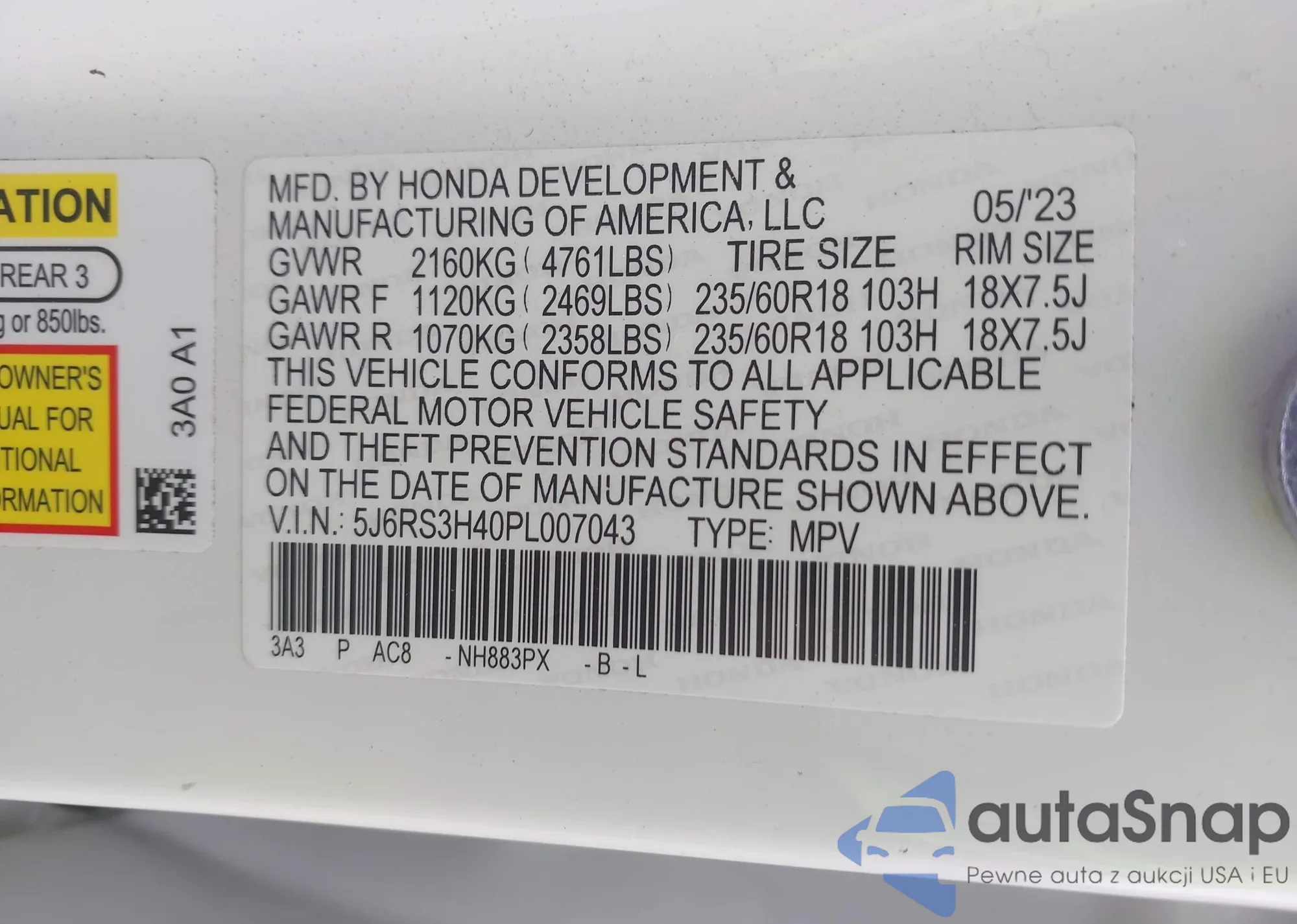 Автомобиль Honda CR-V 2023 (VIN 5J6RS3H40PL007043) ранее не участвовал в торгах. Документы чистые, пробег соответствует или ниже среднего по рынку. Продаётся страховой компанией — рекомендуем покупку. Доставка в порт займет около 6–8 недель.