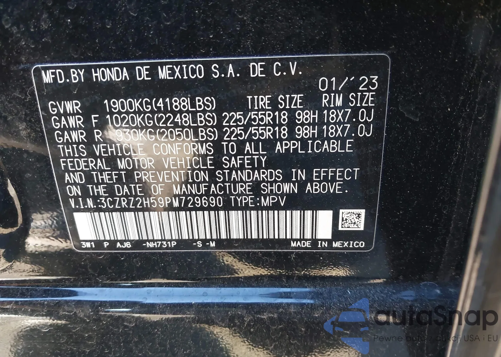 Автомобиль Honda HR-V 2023 (VIN 3CZRZ2H59PM729690) ранее не участвовал в торгах. Документы чистые, пробег соответствует или ниже среднего по рынку. Продаётся страховой компанией — рекомендуем покупку. Доставка в порт займет около 6–8 недель.