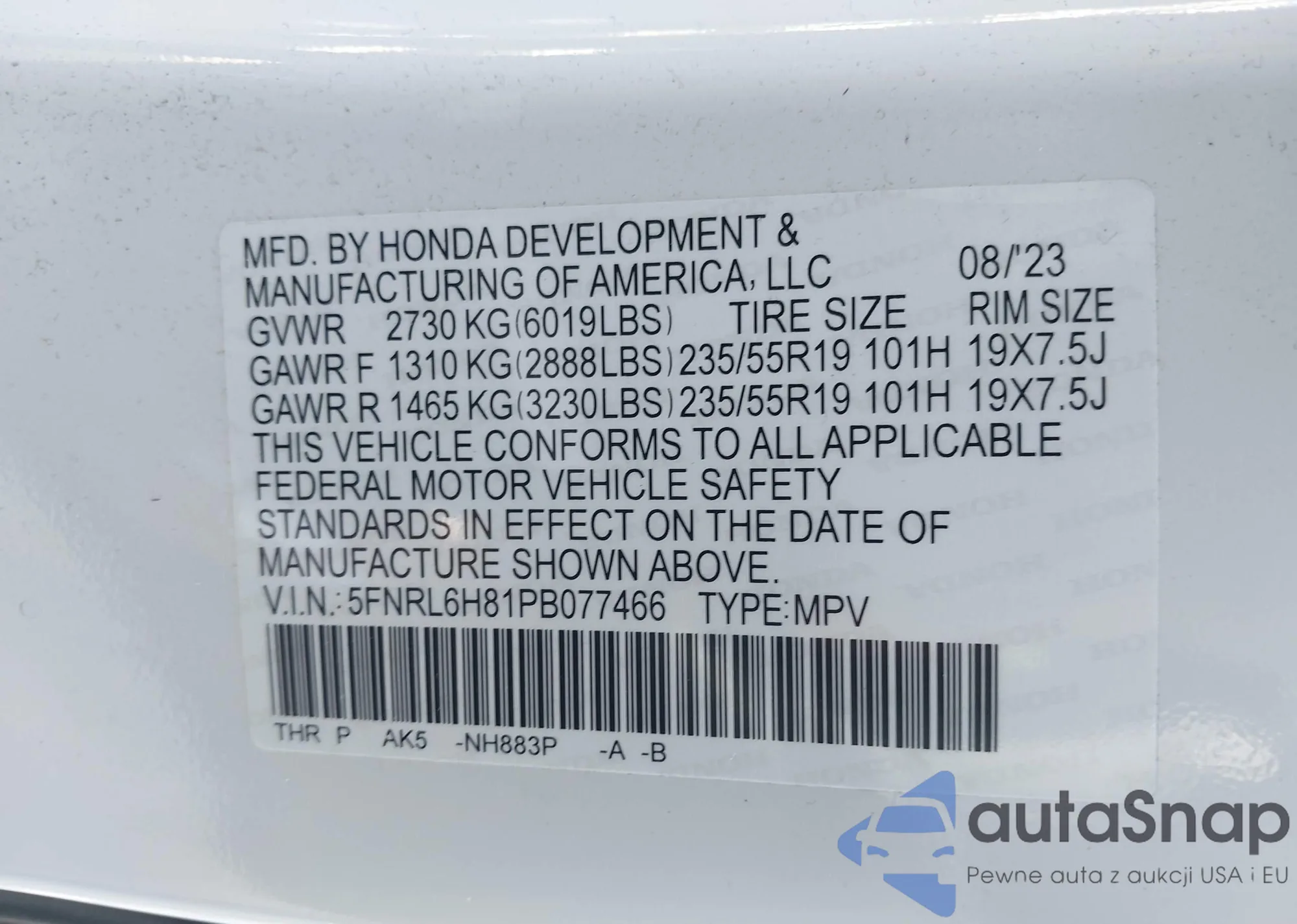 VIN: 5FNRL6H81PB077466