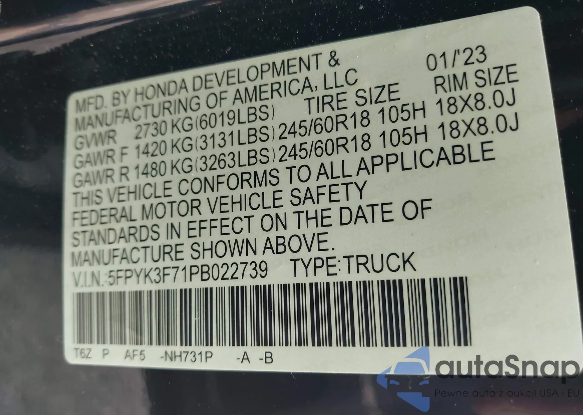 VIN: 5FPYK3F71PB022739