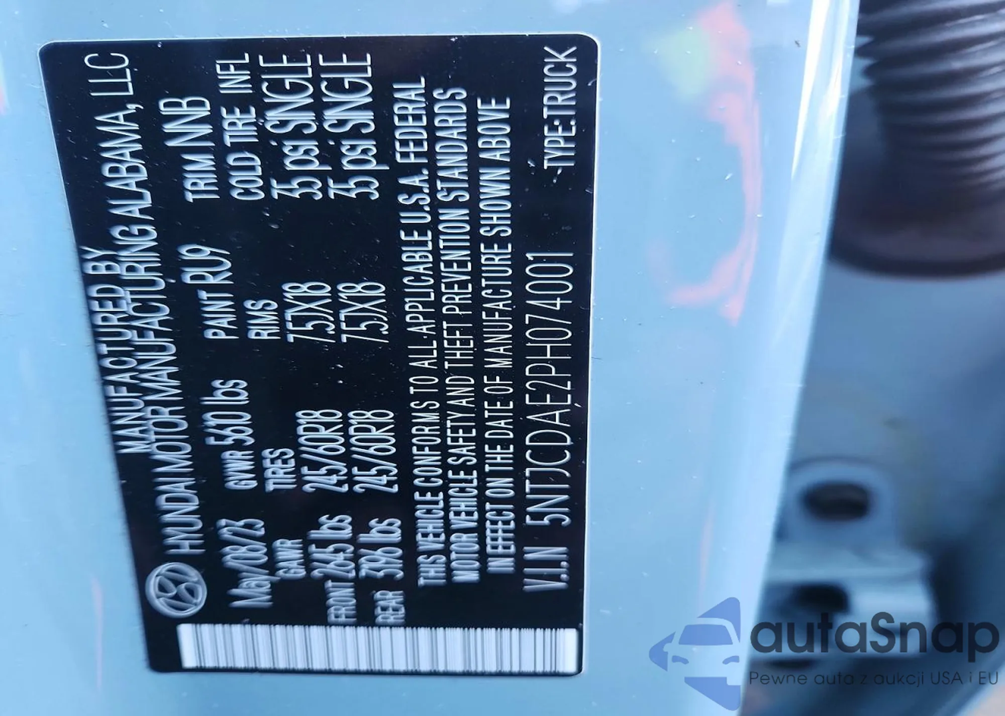 Автомобиль Hyundai Santa Cruz 2023 (VIN 5NTJCDAE2PH074001) ранее не участвовал в торгах. Документы чистые, пробег соответствует или ниже среднего по рынку. Продаётся страховой компанией — рекомендуем покупку. Доставка в порт займет около 6–8 недель.