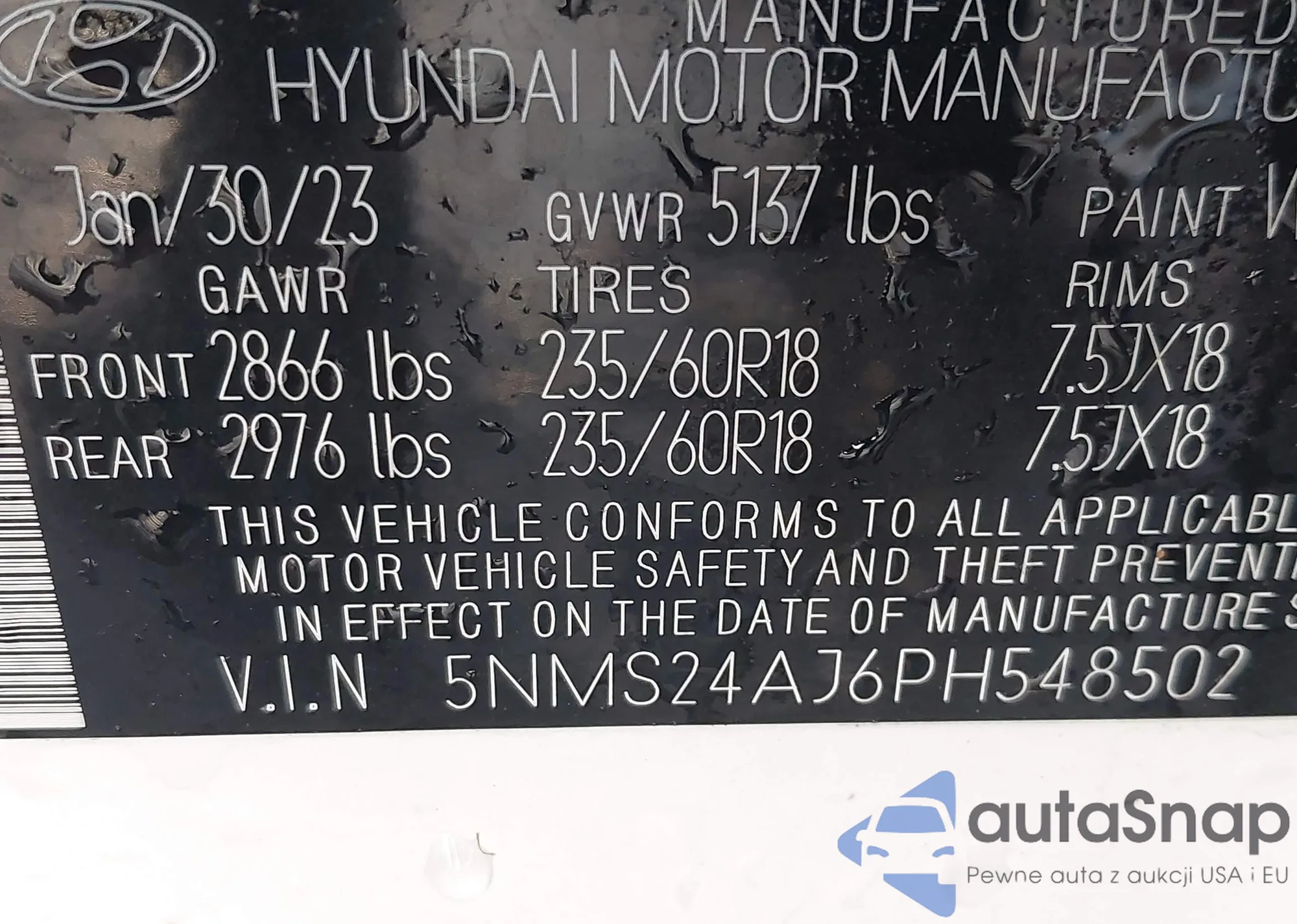 Автомобиль Hyundai Santa Fe 2023 (VIN 5NMS24AJ6PH548502) ранее не участвовал в торгах. Документы чистые, пробег соответствует или ниже среднего по рынку. Продаётся страховой компанией — рекомендуем покупку. Доставка в порт займет около 6–8 недель.