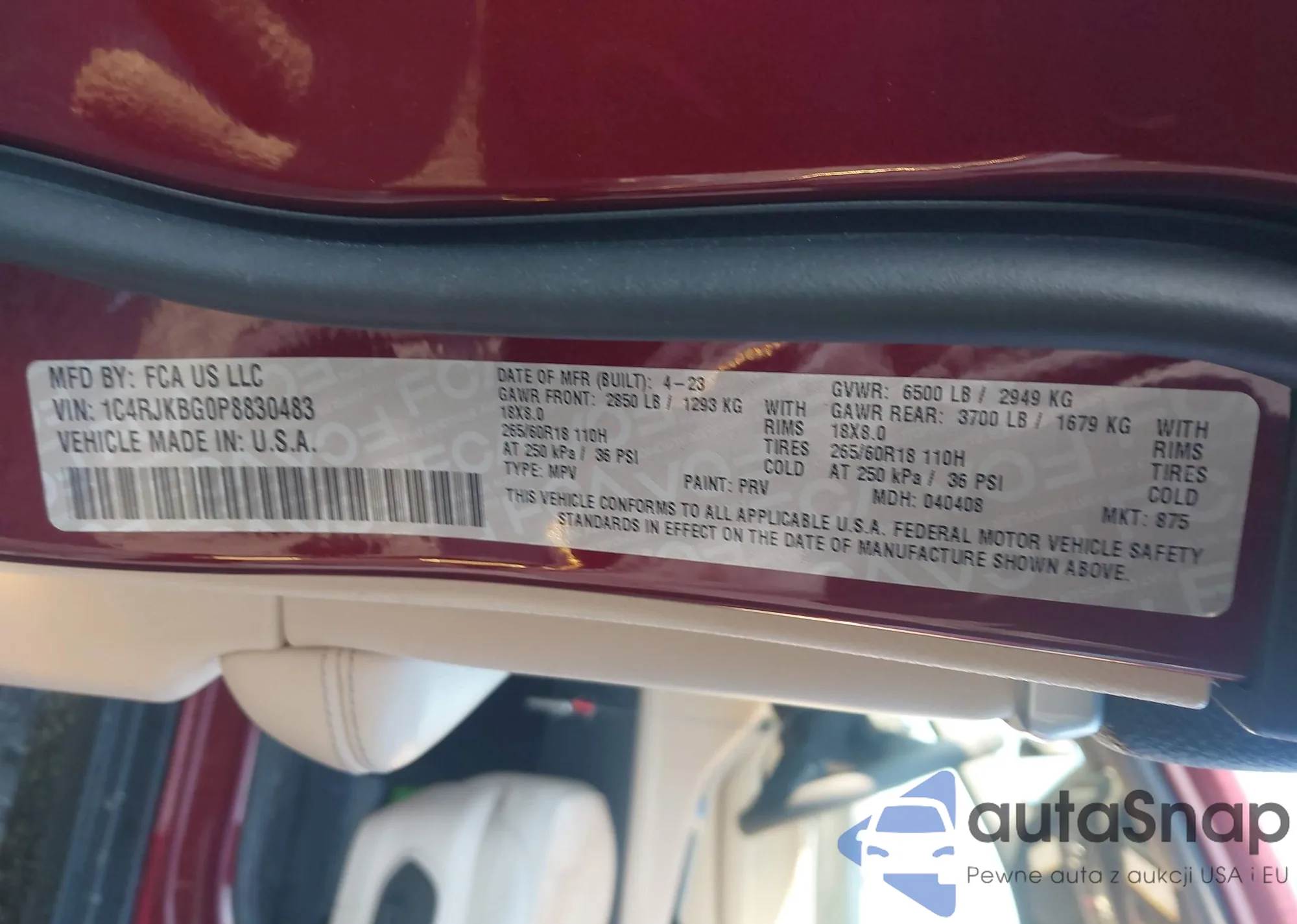 • VIN: 1C4RJKBG0P8830483