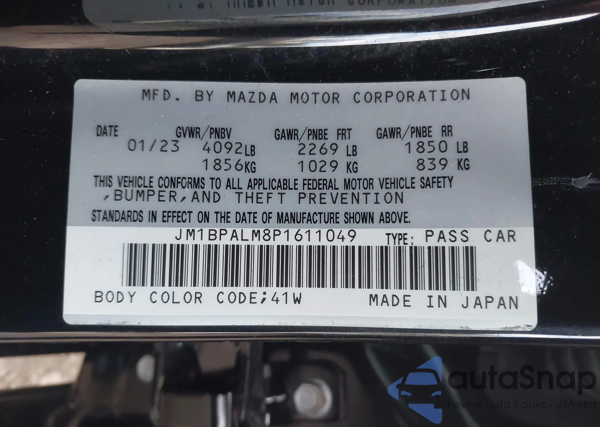 Автомобиль Mazda 3 2023 (VIN JM1BPALM8P1611049) имеет документы, препятствующие регистрации. Могут возникнуть сложности при экспорте и регистрации. Обратитесь к экспертам AutaSnap для поиска альтернатив.