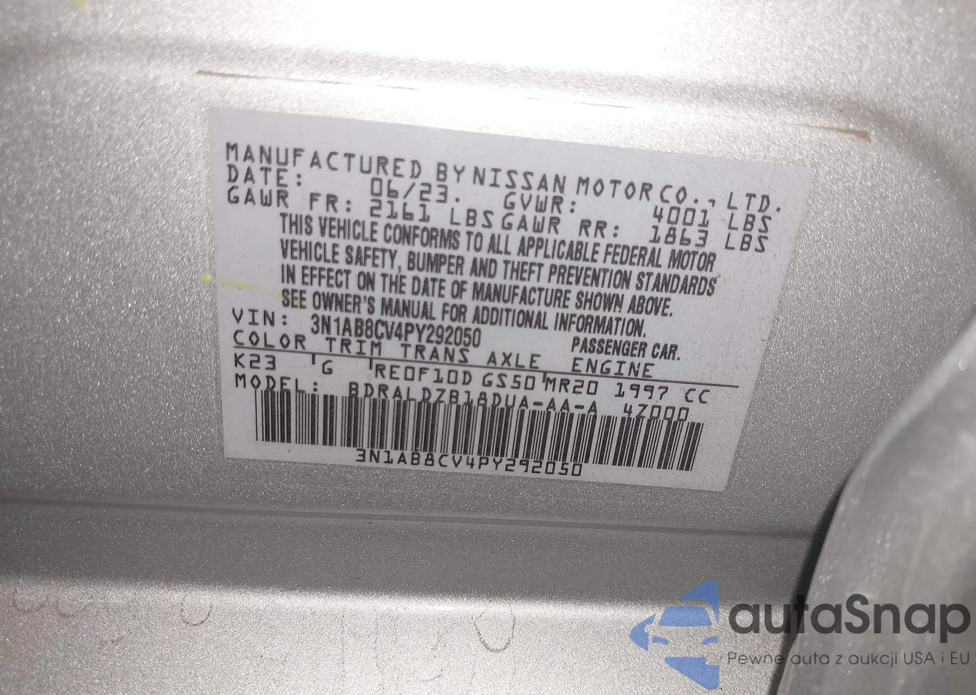 Автомобиль Nissan Sentra 2023 (VIN 3N1AB8CV4PY292050) ранее не участвовал в торгах. Документы чистые, пробег соответствует или ниже среднего по рынку. Продаётся страховой компанией — рекомендуем покупку. Доставка в порт займет около 6–8 недель.