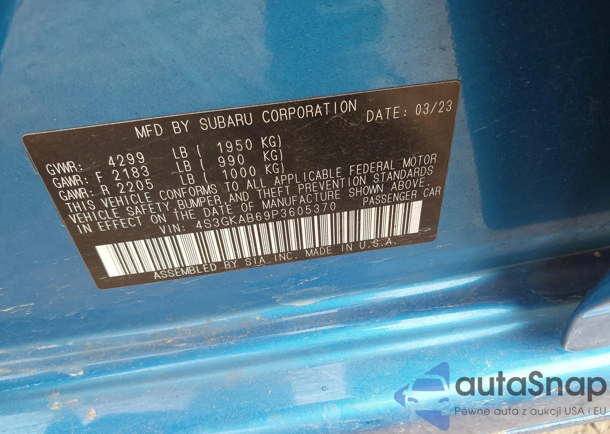 Автомобиль Subaru Impreza 2023 (VIN 4S3GKAB69P3605370) ранее не участвовал в торгах. Документы чистые, пробег соответствует или ниже среднего по рынку. Продаётся страховой компанией — рекомендуем покупку. Доставка в порт займет около 6–8 недель.