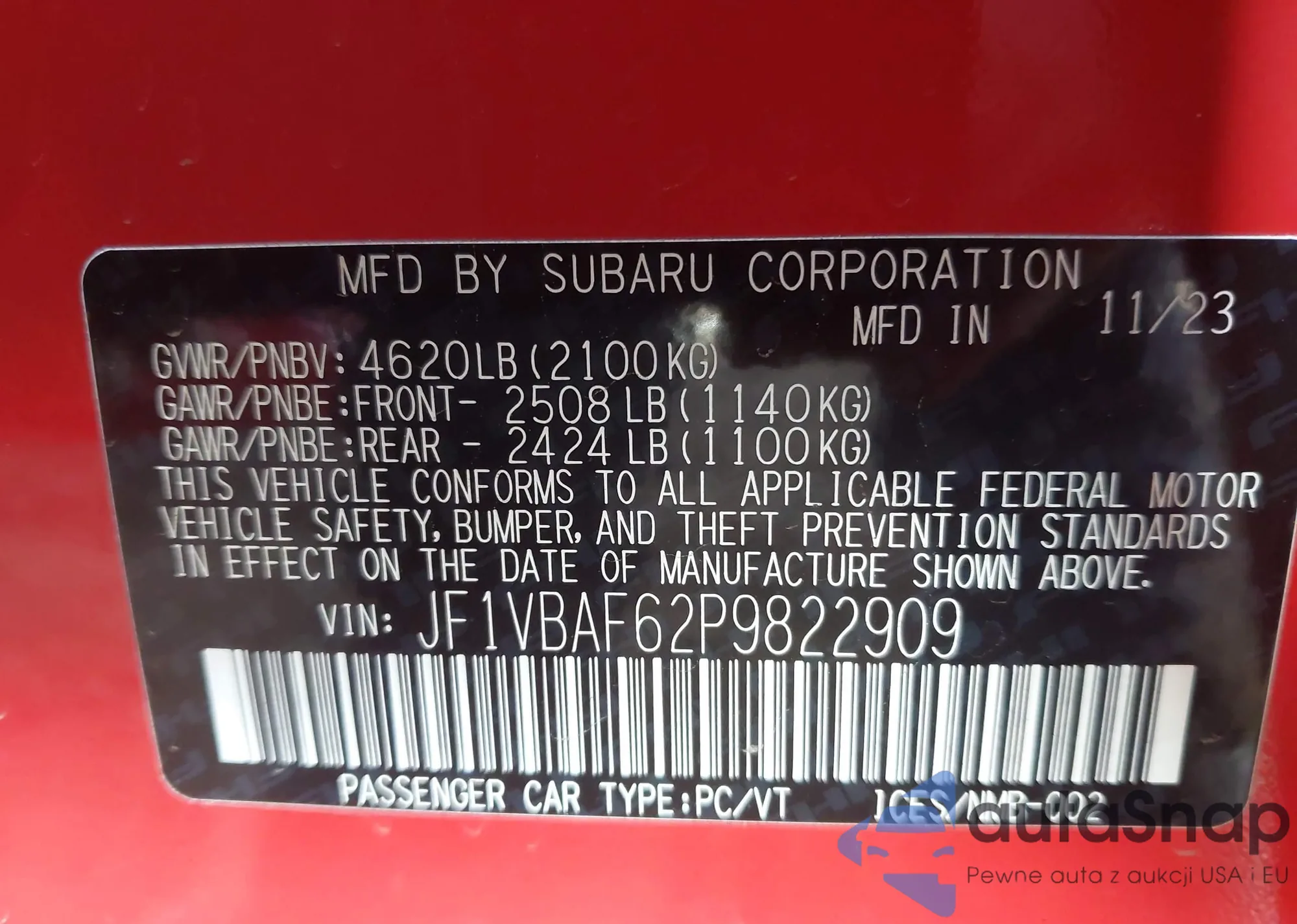 Автомобиль Subaru WRX 2023 (VIN JF1VBAF62P9822909) ранее не участвовал в торгах. Документы чистые, пробег соответствует или ниже среднего по рынку. Продаётся страховой компанией — рекомендуем покупку. Доставка в порт займет около 6–8 недель.