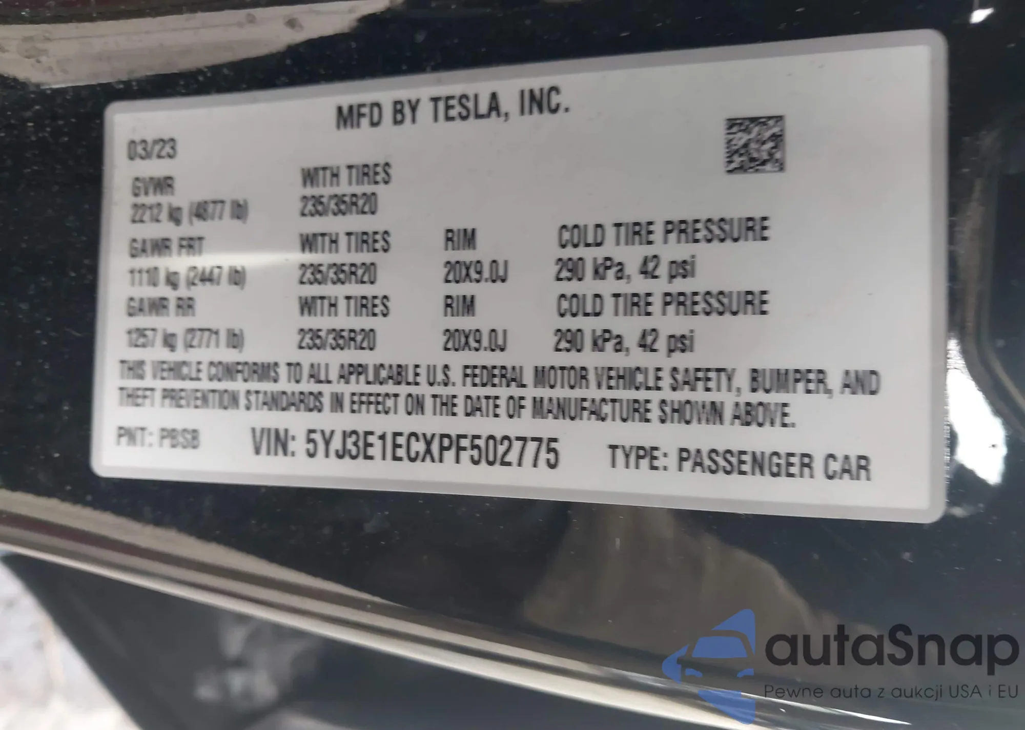 Автомобиль Tesla Model 3 2023 (VIN 5YJ3E1ECXPF502775) ранее не участвовал в торгах. Документы чистые, пробег соответствует или ниже среднего по рынку. Продаётся страховой компанией — рекомендуем покупку. Доставка в порт займет около 6–8 недель.