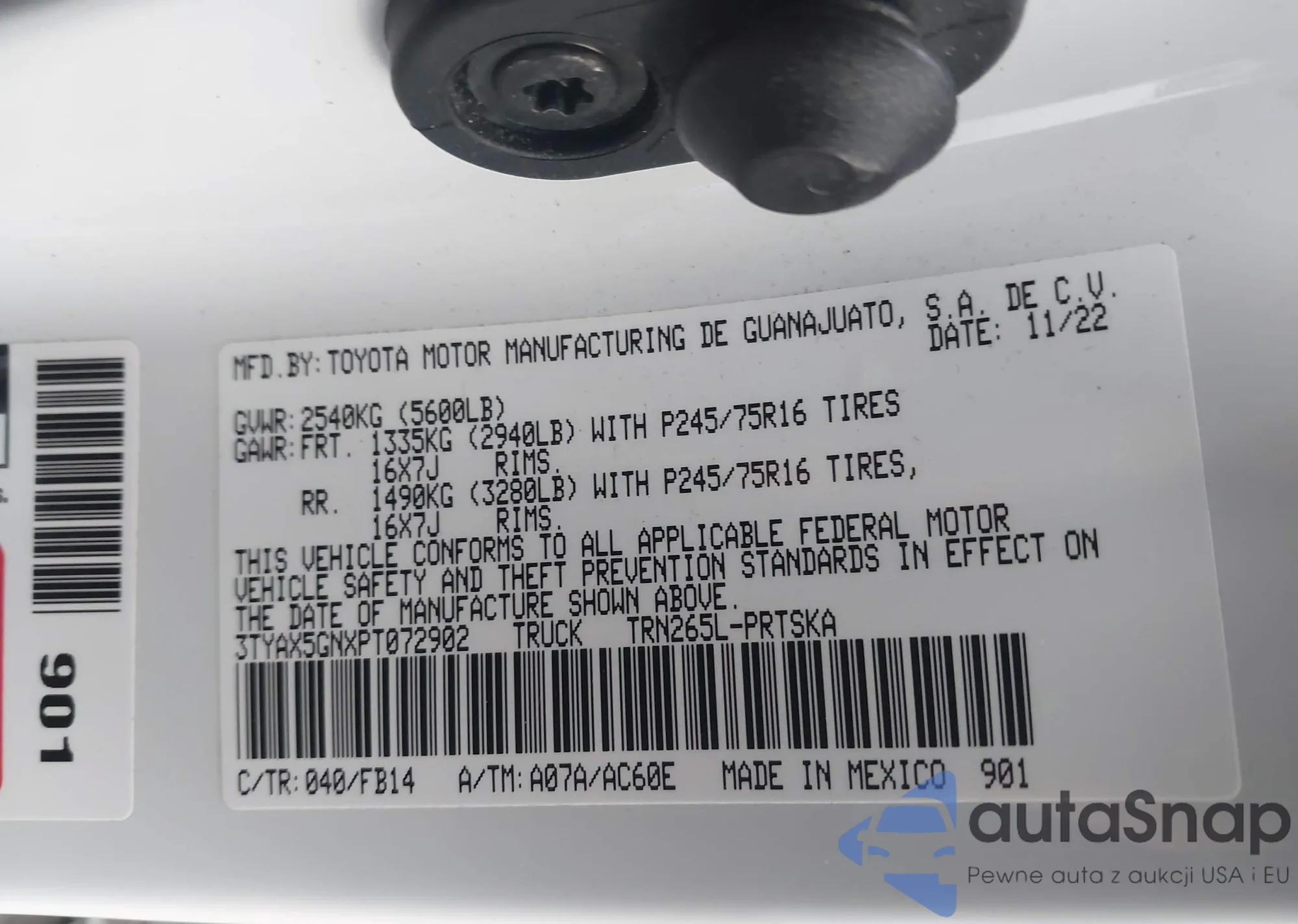 Автомобиль Toyota Tacoma 2023 (VIN 3TYAX5GNXPT072902) ранее не участвовал в торгах. Документы чистые, пробег соответствует или ниже среднего по рынку. Продаётся страховой компанией — рекомендуем покупку. Доставка в порт займет около 6–8 недель.