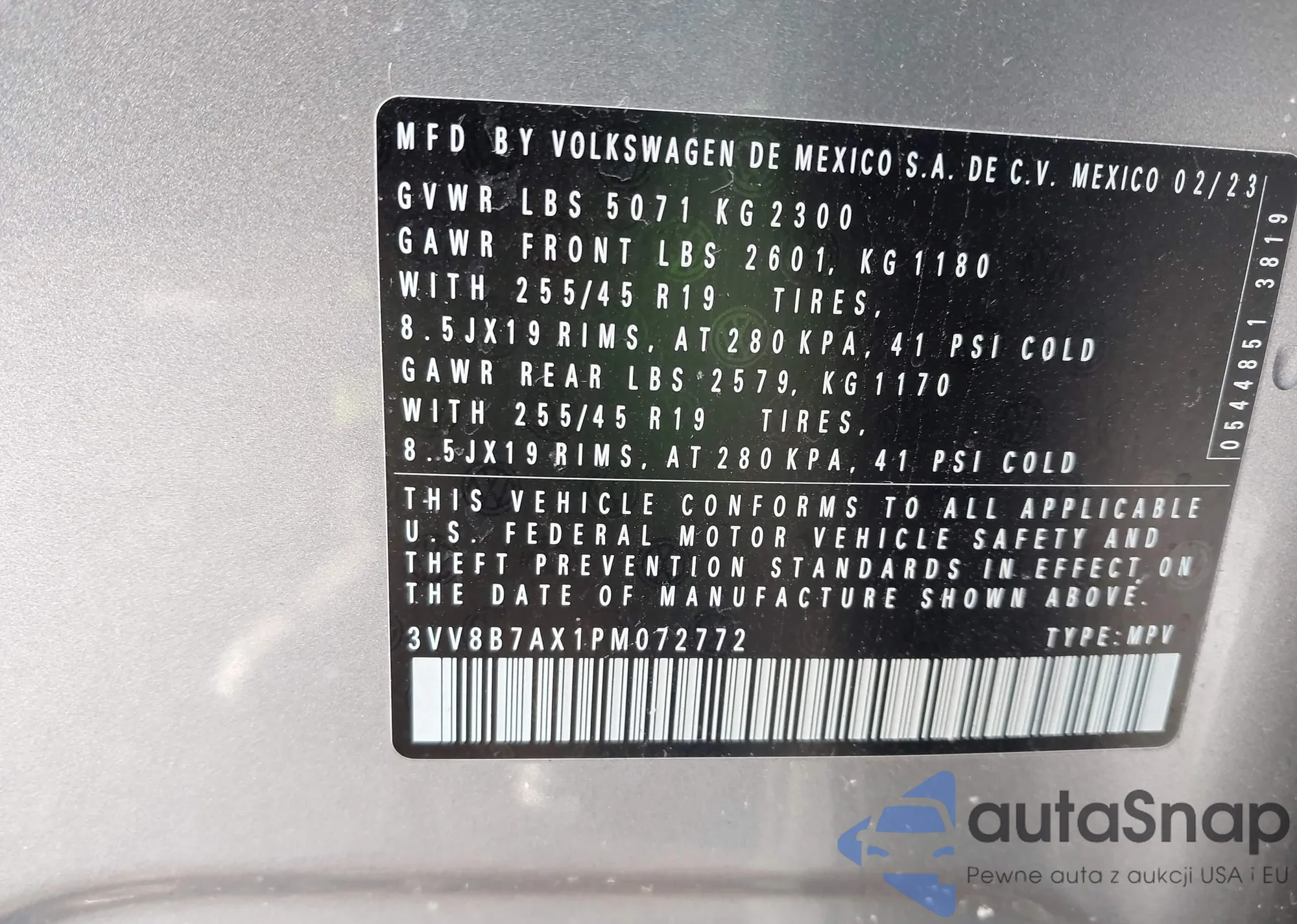 Автомобиль Volkswagen Tiguan 2023 (VIN 3VV8B7AX1PM072772) ранее не участвовал в торгах. Документы чистые, пробег соответствует или ниже среднего по рынку. Продаётся страховой компанией — рекомендуем покупку. Доставка в порт займет около 6–8 недель.