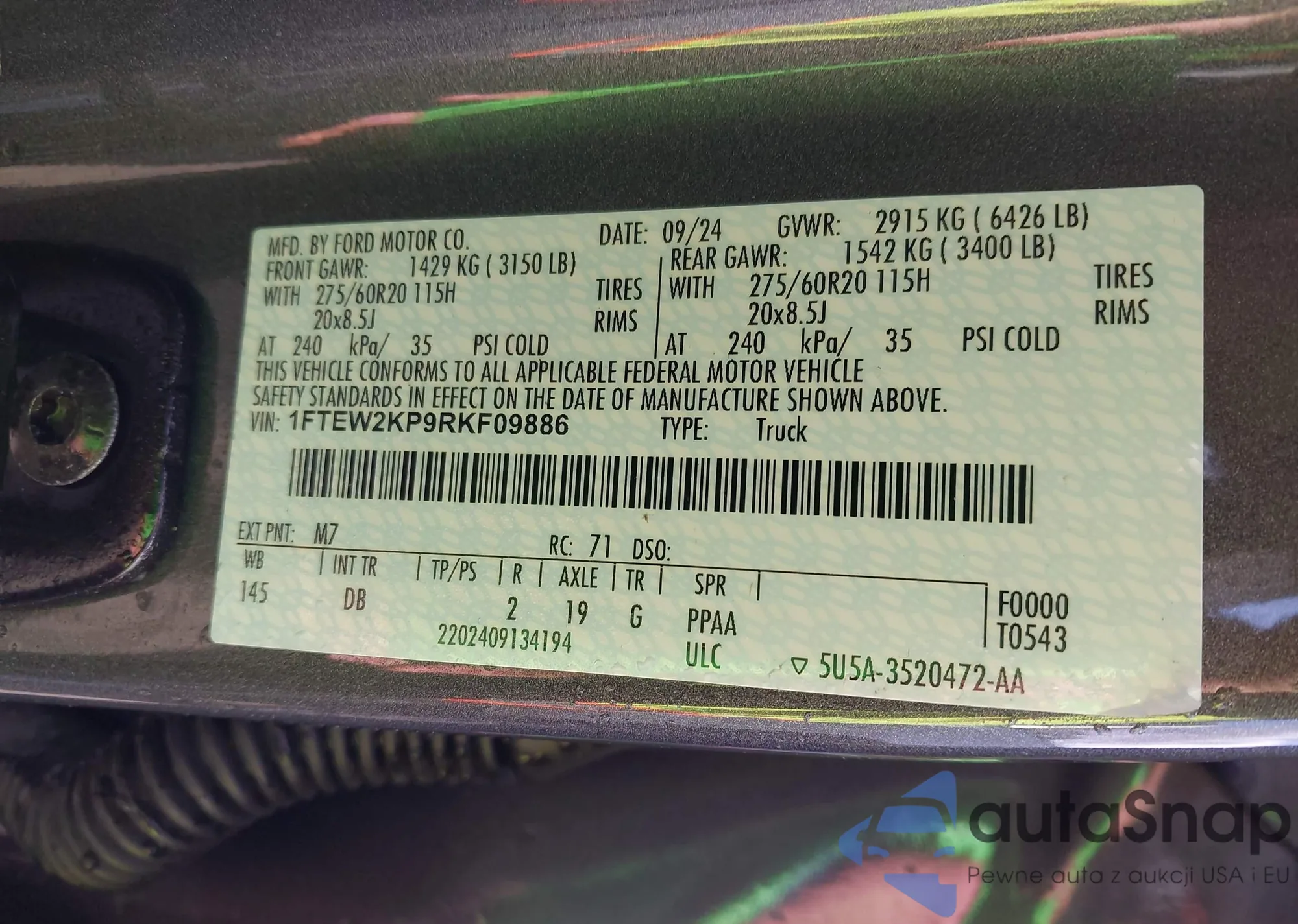 Автомобиль Ford F-150 2024 (VIN 1FTEW2KP9RKF09886) ранее не участвовал в торгах. Документы чистые, пробег соответствует или ниже среднего по рынку. Продаётся страховой компанией — рекомендуем покупку. Доставка в порт займет около 6–8 недель.