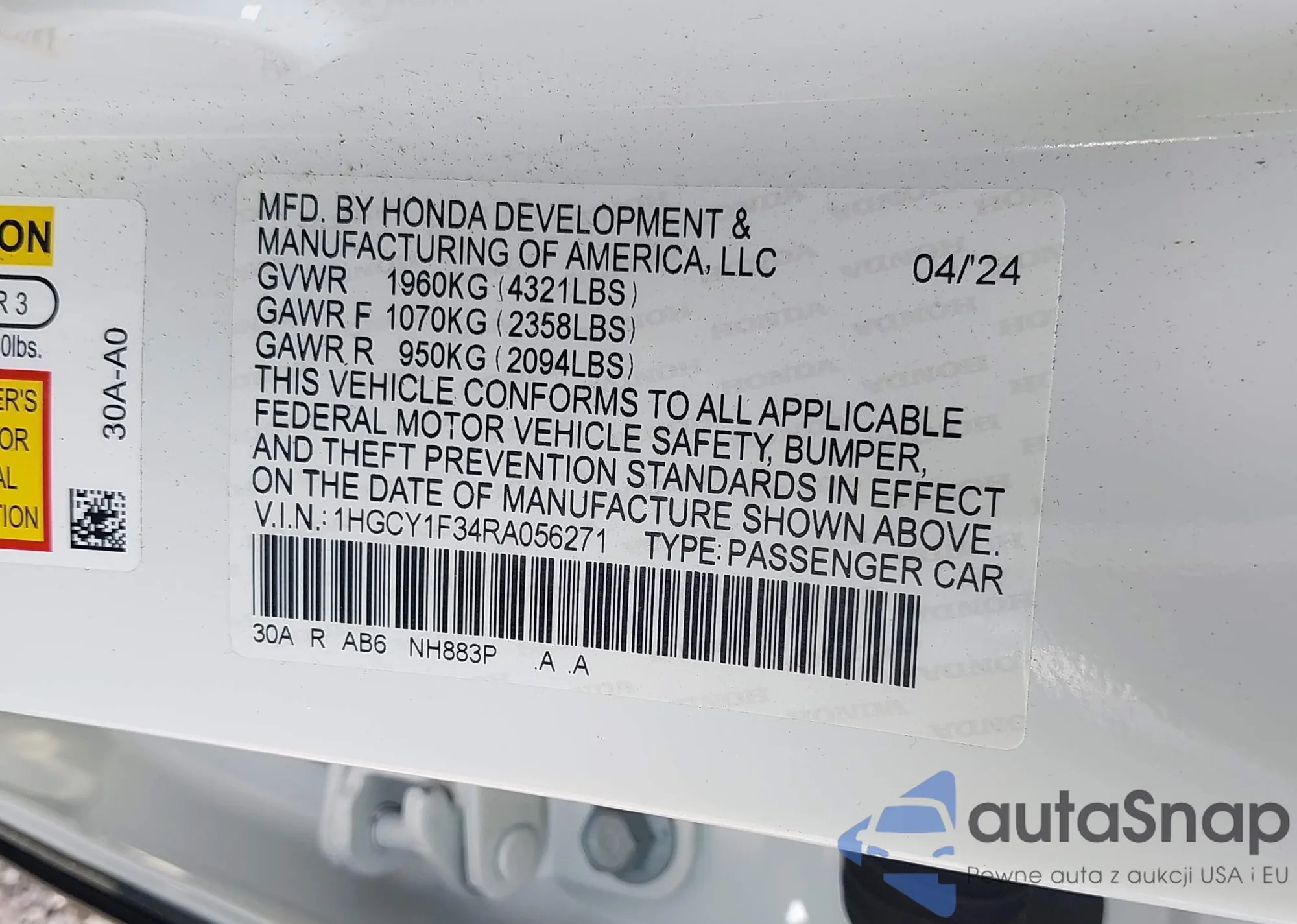 • VIN: 1HGCY1F34RA056271