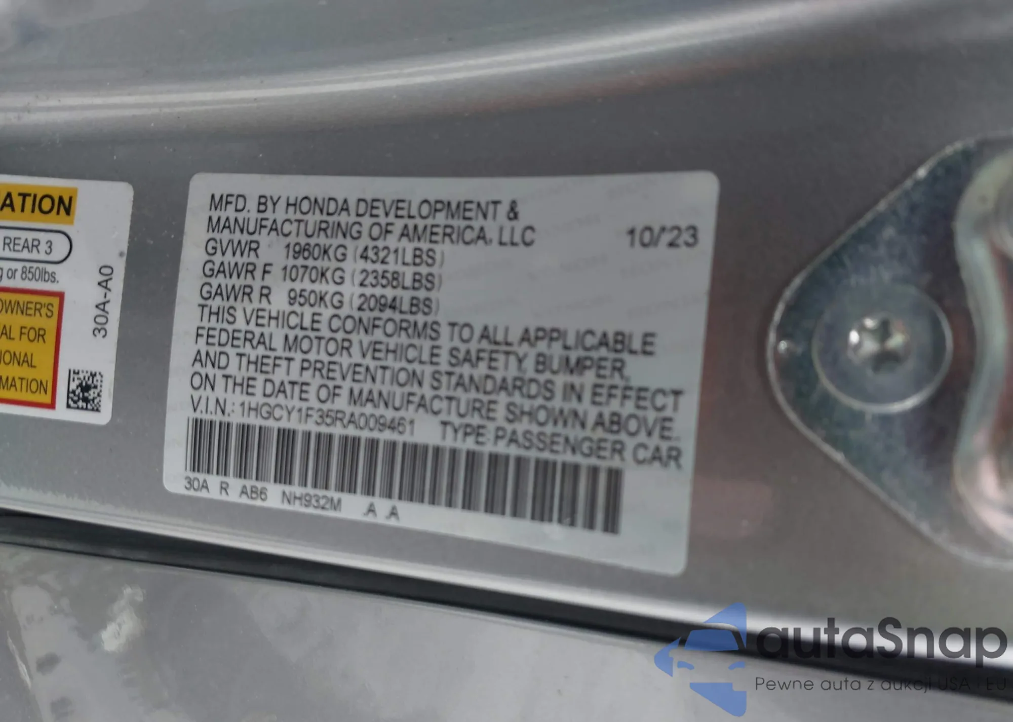VIN: 1HGCY1F35RA009461
