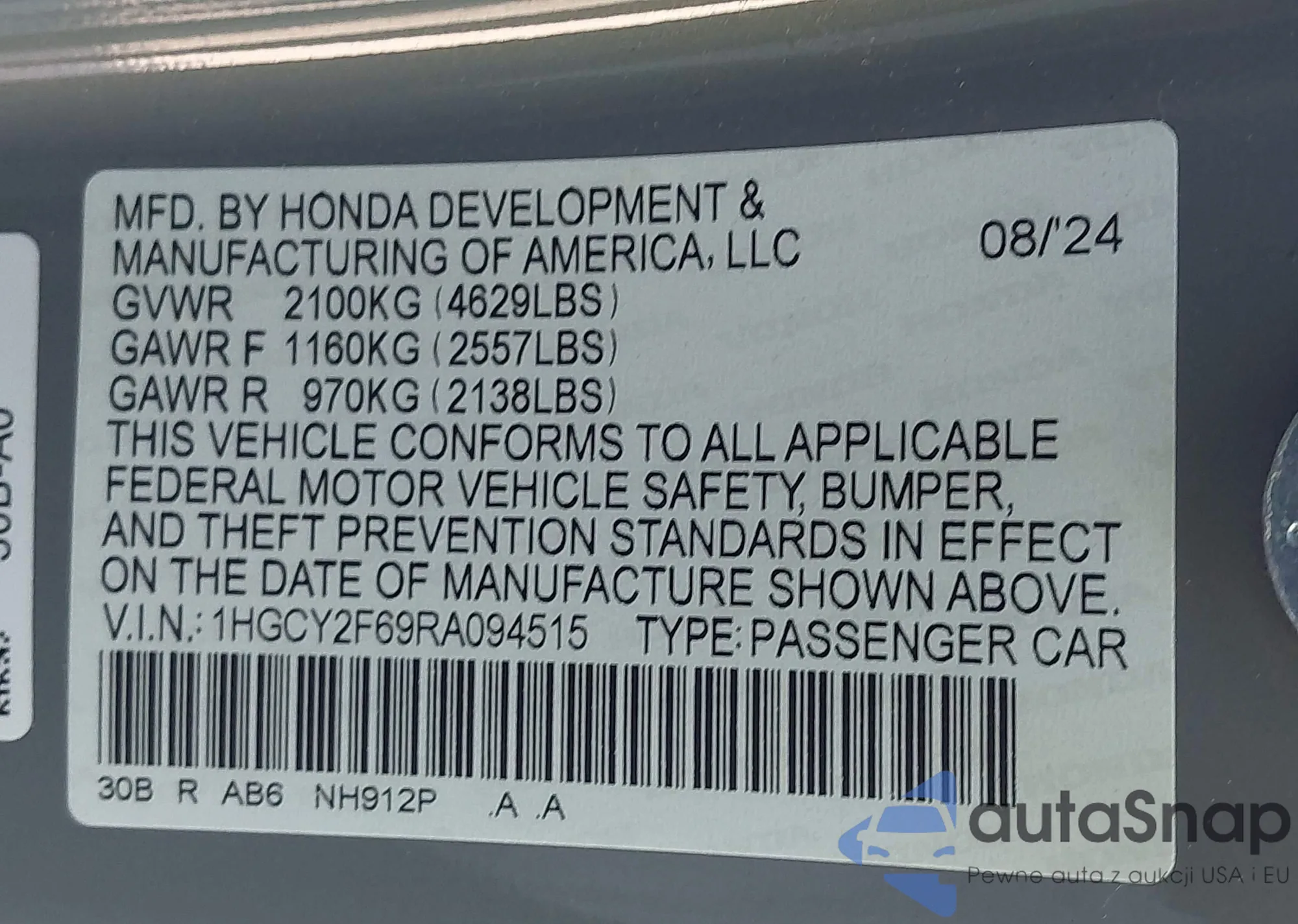 Автомобиль Honda Accord 2024 (VIN 1HGCY2F69RA094515) ранее не участвовал в торгах. Документы чистые, пробег соответствует или ниже среднего по рынку. Продаётся страховой компанией — рекомендуем покупку. Доставка в порт займет около 6–8 недель.