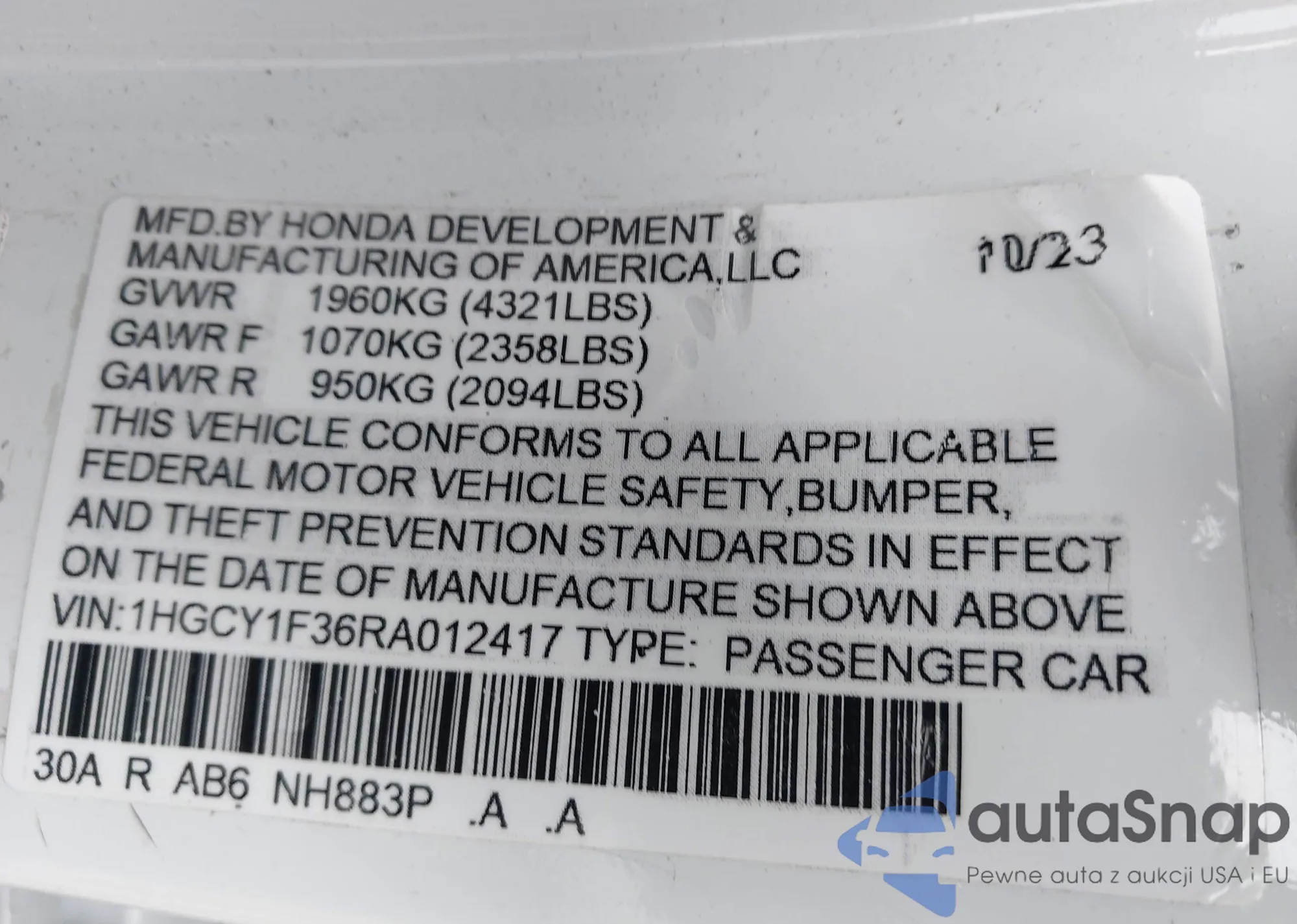VIN: 1HGCY2F50RA018270