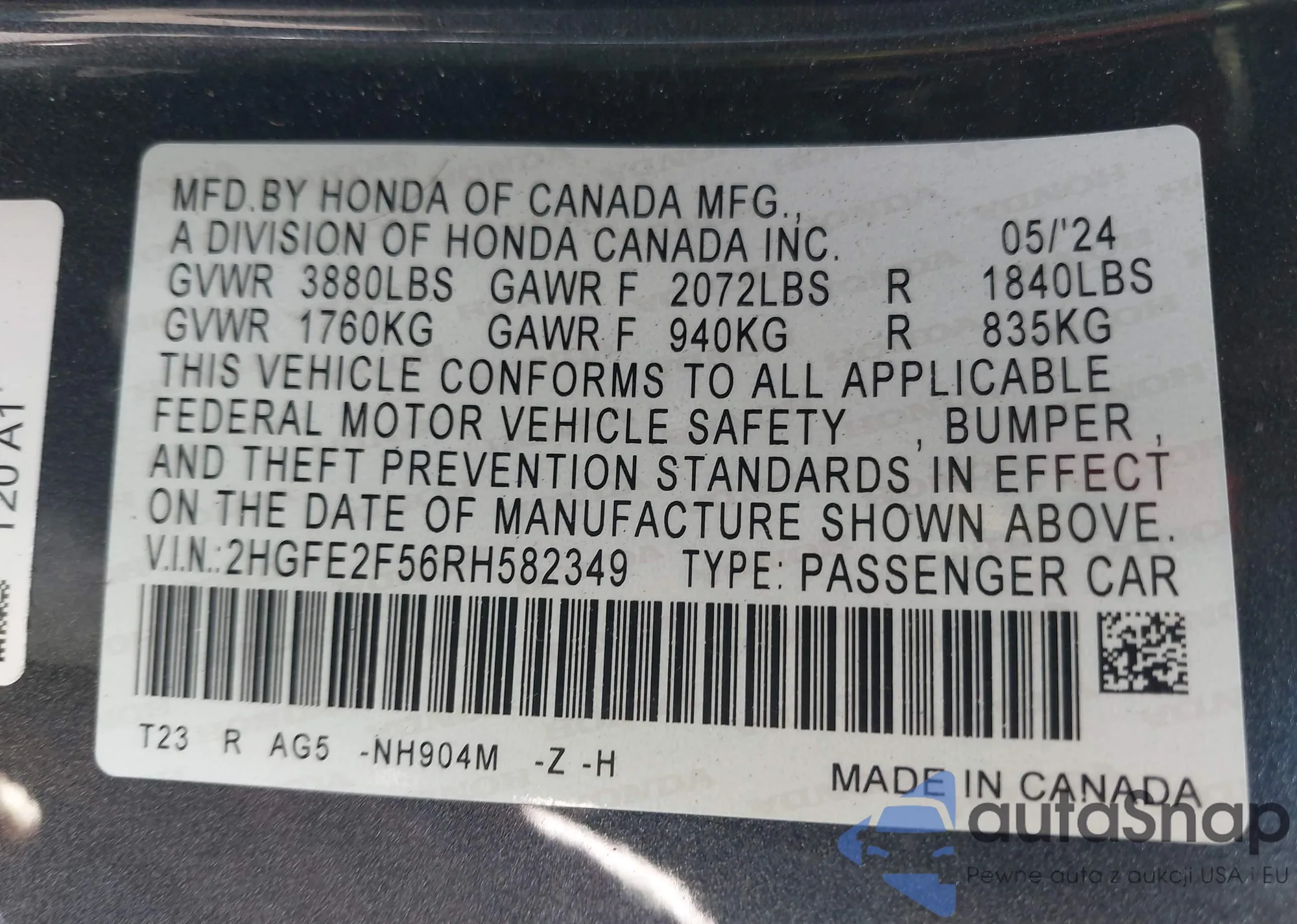 VIN: 2HGFE2F56RH582349