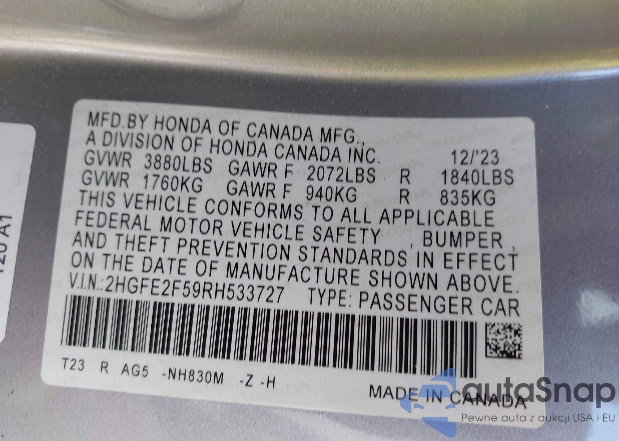 VIN: 2HGFE2F59RH533727