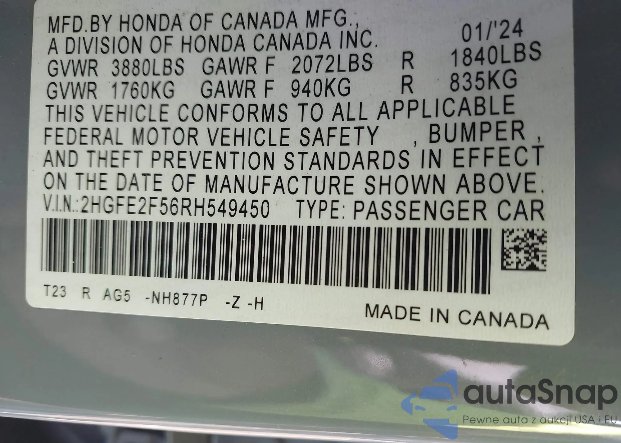 VIN: 2HGFE2F56RH549450