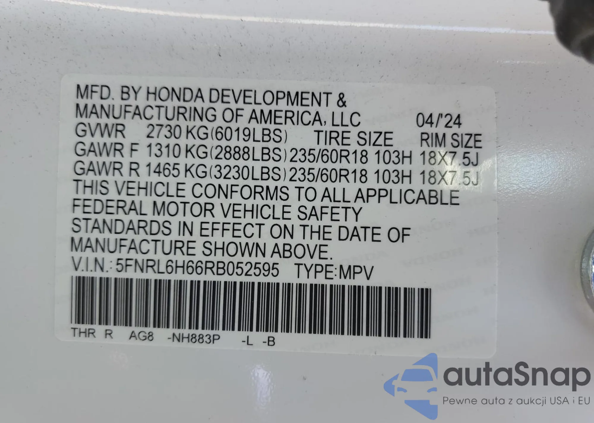 VIN: 5FNRL6H66RB052595