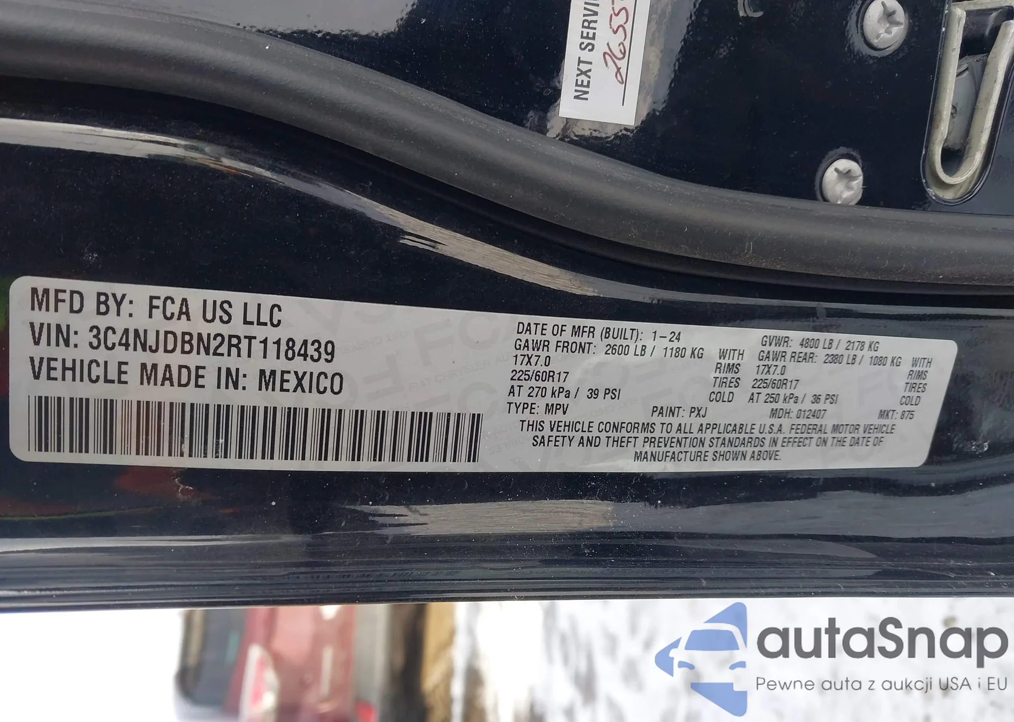 Автомобиль Jeep Compass 2024 (VIN 3C4NJDBN2RT118439) имеет документы, препятствующие регистрации. Могут возникнуть сложности при экспорте и регистрации. Обратитесь к экспертам AutaSnap для поиска альтернатив.