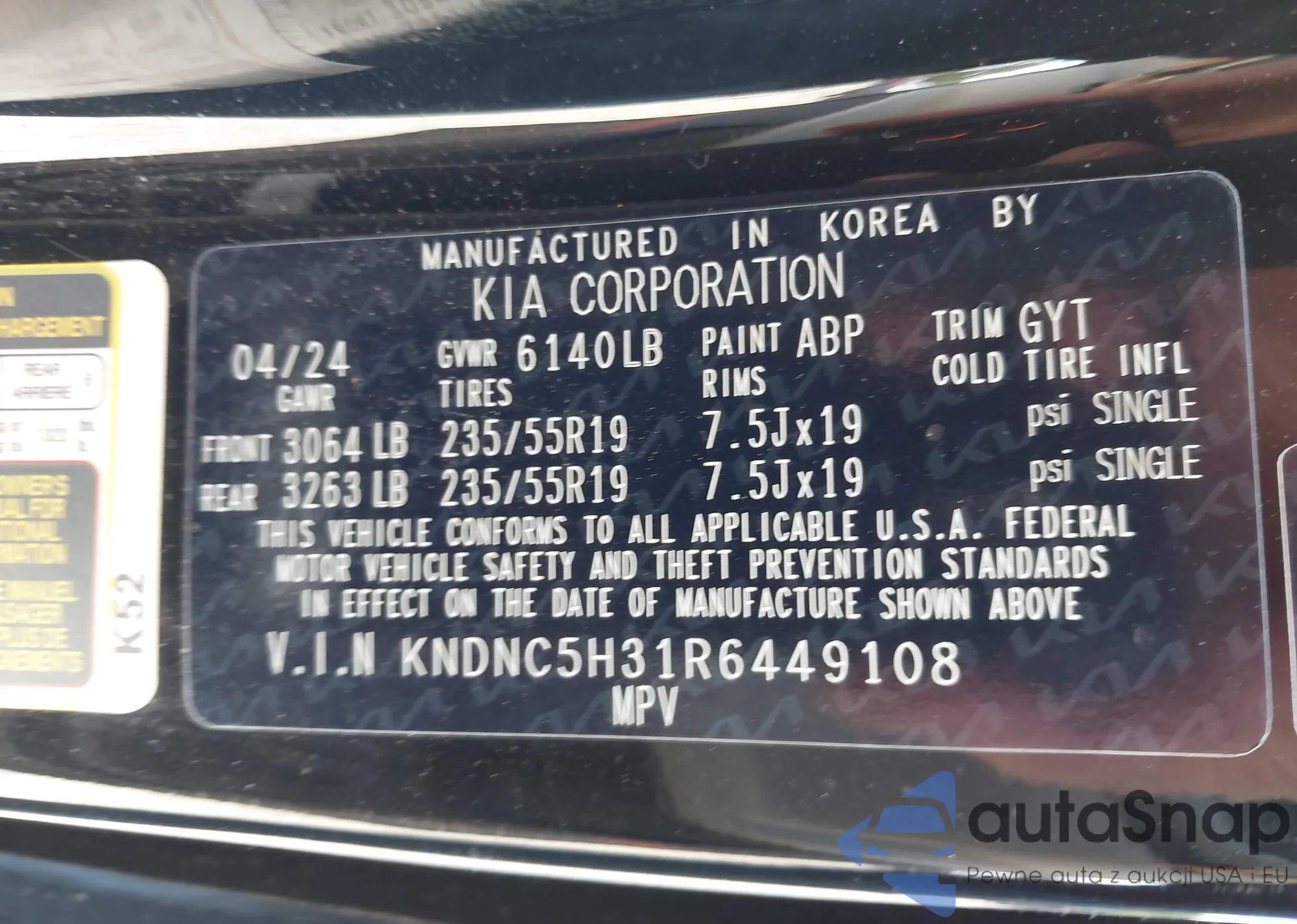 Автомобиль Kia Carnival 2024 (VIN KNDNC5H31R6449108) имеет документы, препятствующие регистрации. Могут возникнуть сложности при экспорте и регистрации. Обратитесь к экспертам AutaSnap для поиска альтернатив.