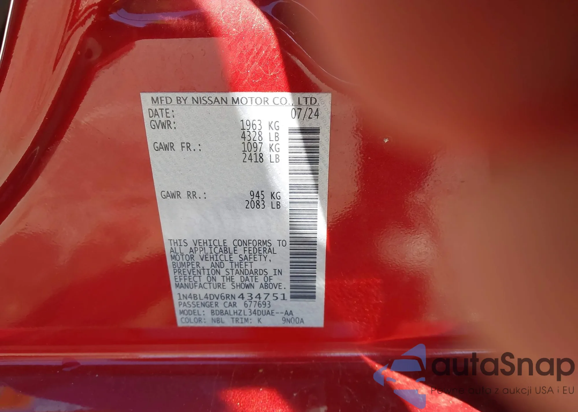 Автомобиль Nissan Altima 2024 (VIN 1N4BL4DV6RN434751) ранее не участвовал в торгах. Документы чистые, пробег соответствует или ниже среднего по рынку. Продаётся страховой компанией — рекомендуем покупку. Доставка в порт займет около 6–8 недель.