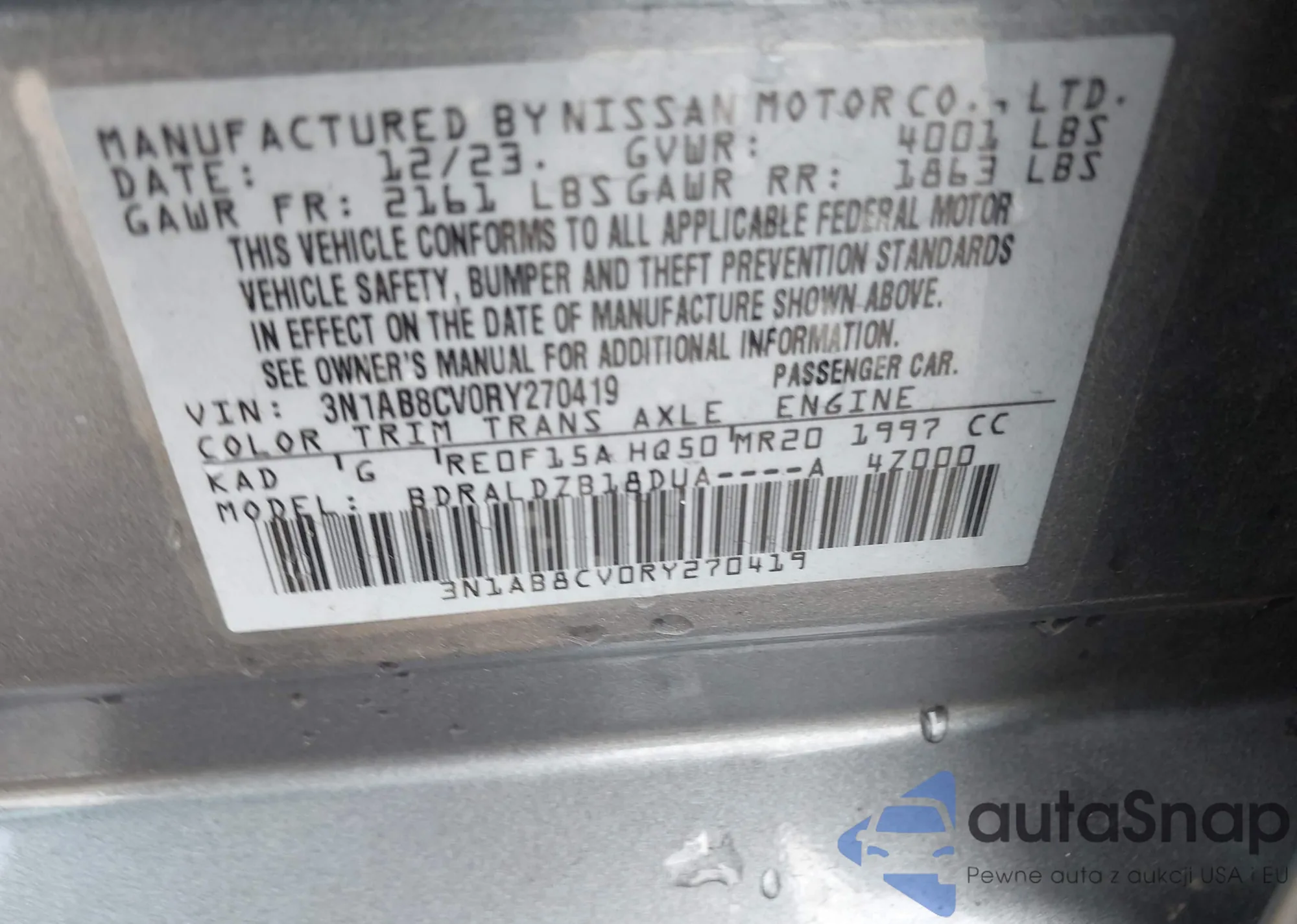 Автомобиль Nissan Sentra 2024 (VIN 3N1AB8CV0RY270419) ранее не участвовал в торгах. Документы чистые, пробег соответствует или ниже среднего по рынку. Продаётся страховой компанией — рекомендуем покупку. Доставка в порт займет около 6–8 недель.