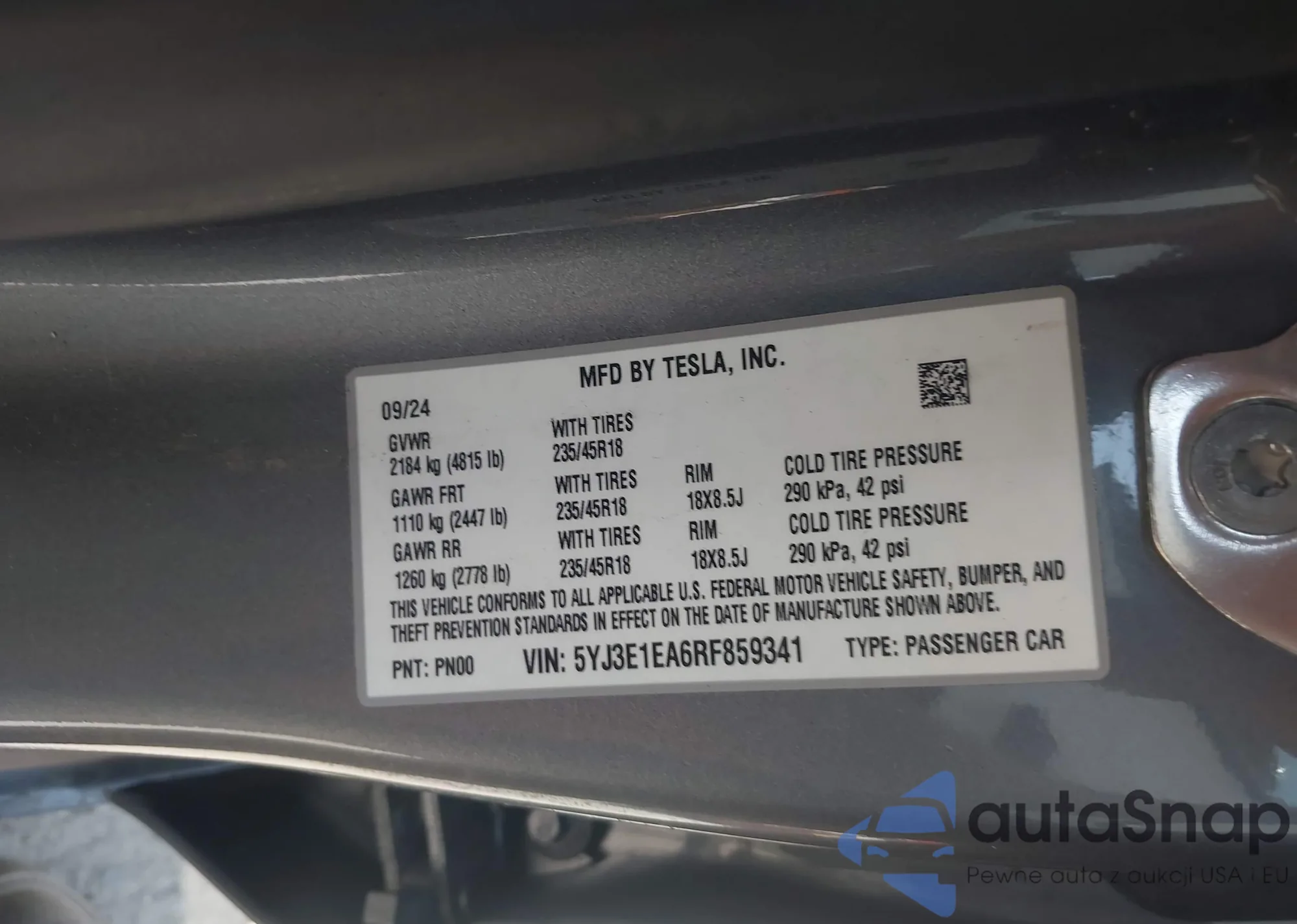 • VIN: 5YJ3E1EA6RF859341