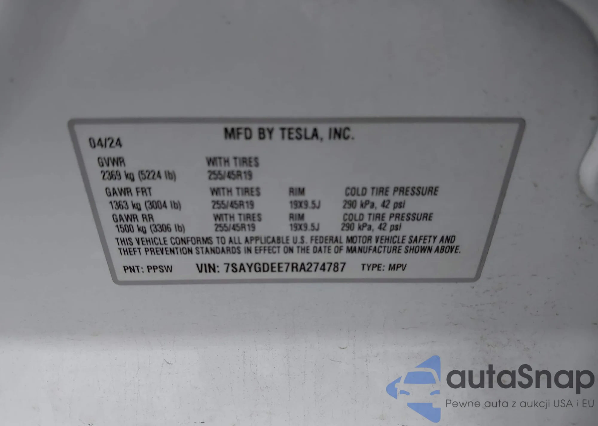 VIN: 7SAYGDEE7RA274787