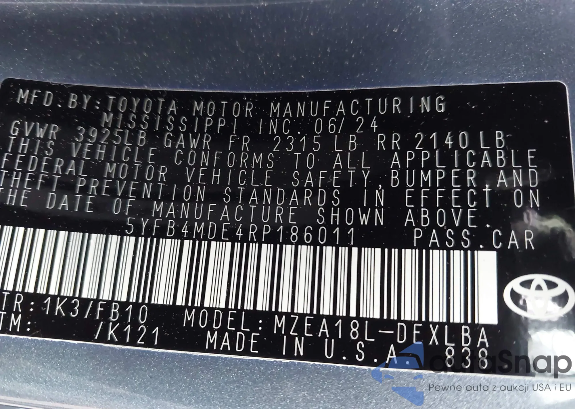 Автомобиль Toyota Corolla 2024 (VIN 5YFB4MDE4RP186011) ранее не участвовал в торгах. Документы чистые, пробег соответствует или ниже среднего по рынку. Продаётся страховой компанией — рекомендуем покупку. Доставка в порт займет около 6–8 недель.