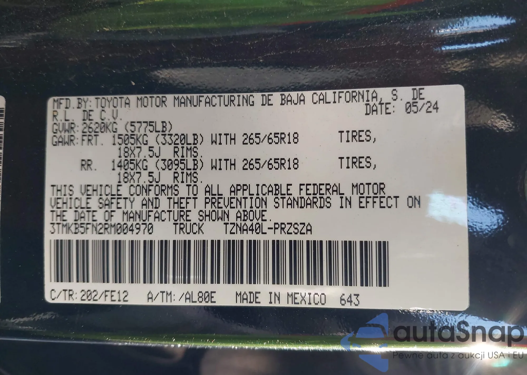 Автомобиль Toyota Tacoma 2024 (VIN 3TMKB5FN2RM004970) ранее не участвовал в торгах. Документы чистые, пробег соответствует или ниже среднего по рынку. Продаётся страховой компанией — рекомендуем покупку. Доставка в порт займет около 6–8 недель.