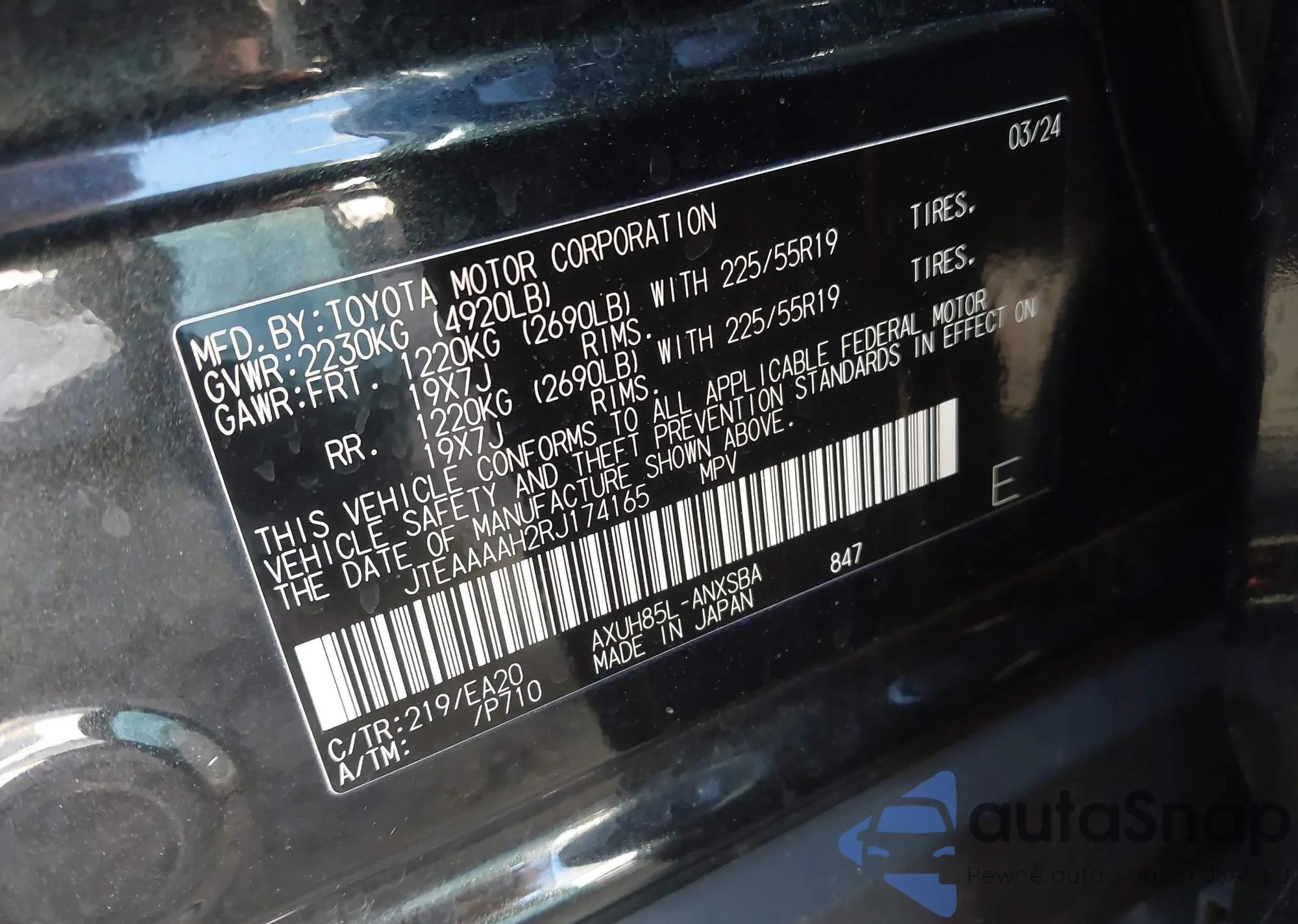 Автомобиль Toyota Venza 2024 (VIN JTEAAAAH2RJ174165) имеет документы, препятствующие регистрации. Могут возникнуть сложности при экспорте и регистрации. Обратитесь к экспертам AutaSnap для поиска альтернатив.