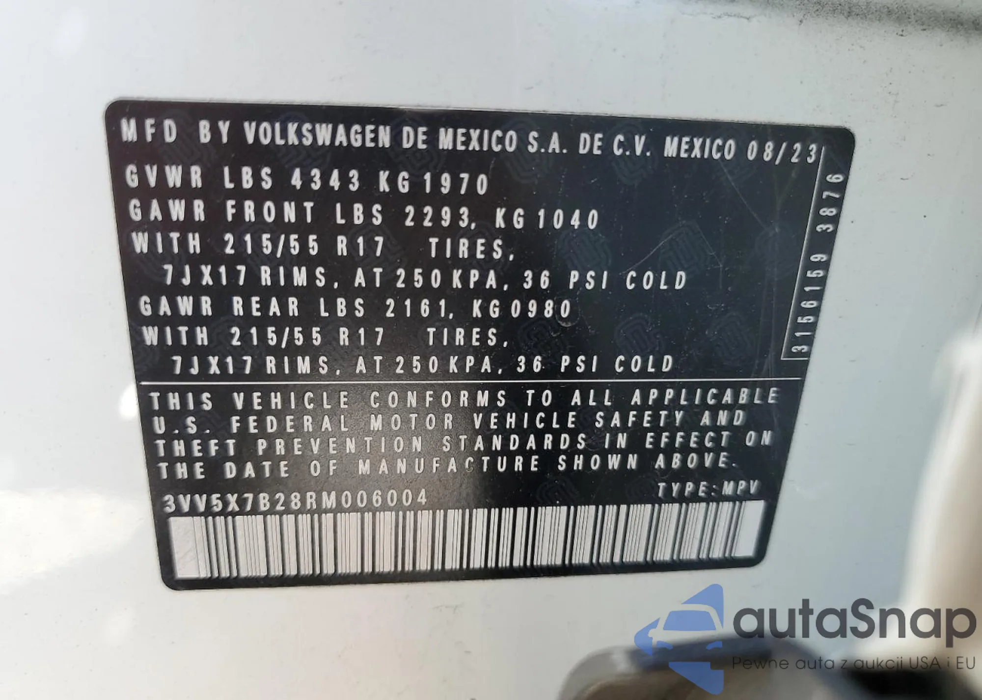 Автомобиль Volkswagen Taos 2024 (VIN 3VV5X7B28RM006004) ранее не участвовал в торгах. Документы чистые, пробег соответствует или ниже среднего по рынку. Продаётся страховой компанией — рекомендуем покупку. Доставка в порт займет около 6–8 недель.