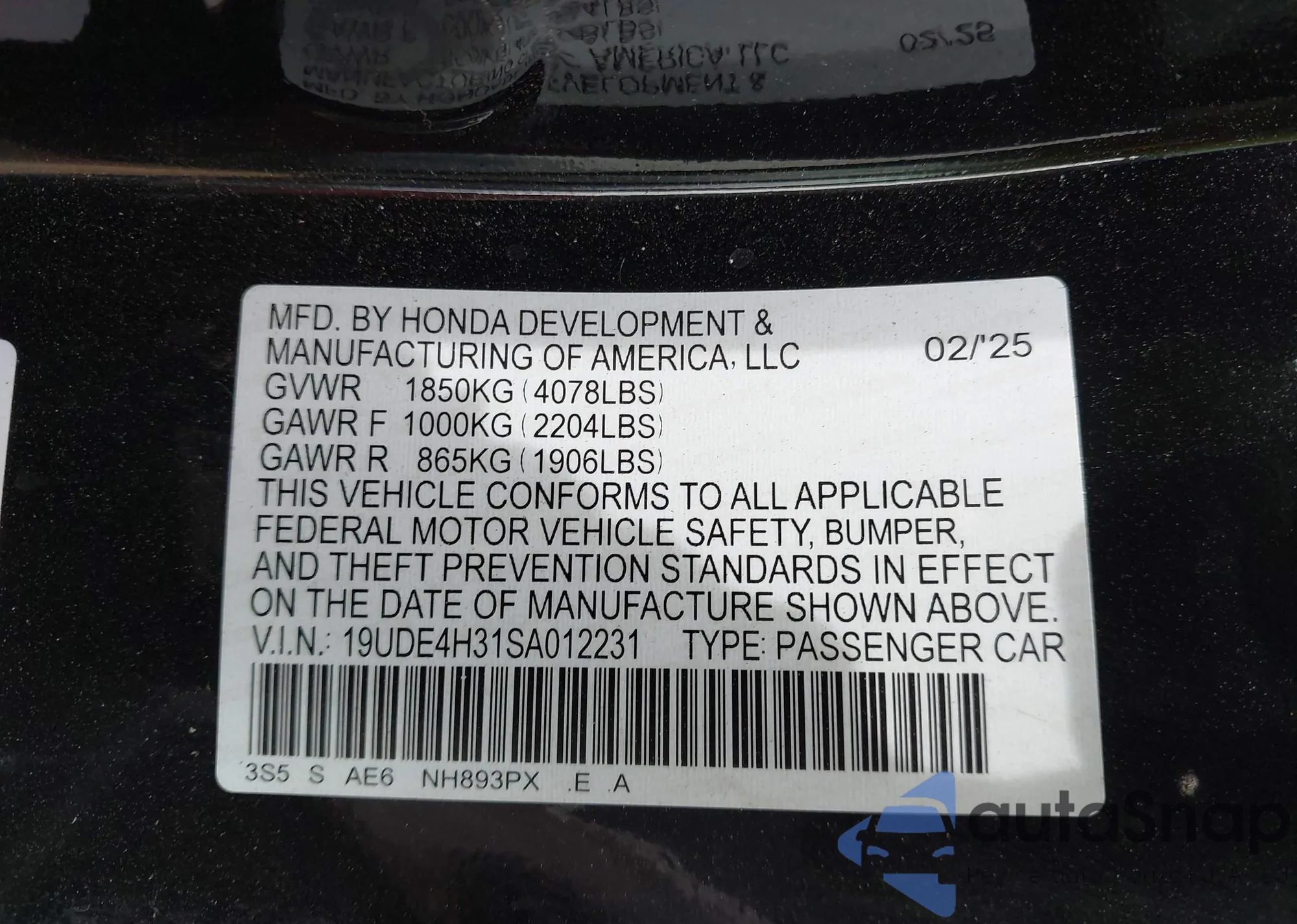 VIN: 19UDE4H31SA012231