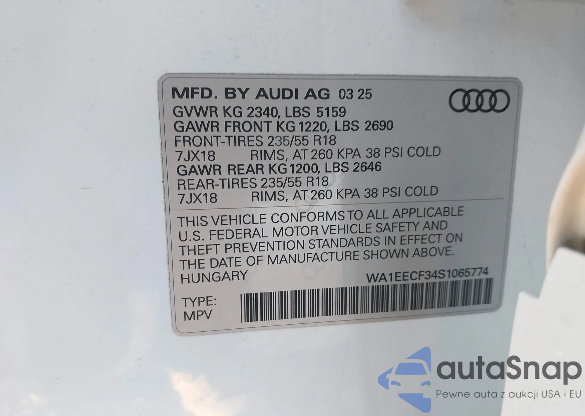 Автомобиль Audi Q3 2025 (VIN WA1EECF34S1065774) ранее не участвовал в торгах. Документы чистые, пробег соответствует или ниже среднего по рынку. Продаётся страховой компанией — рекомендуем покупку. Доставка в порт займет около 6–8 недель.